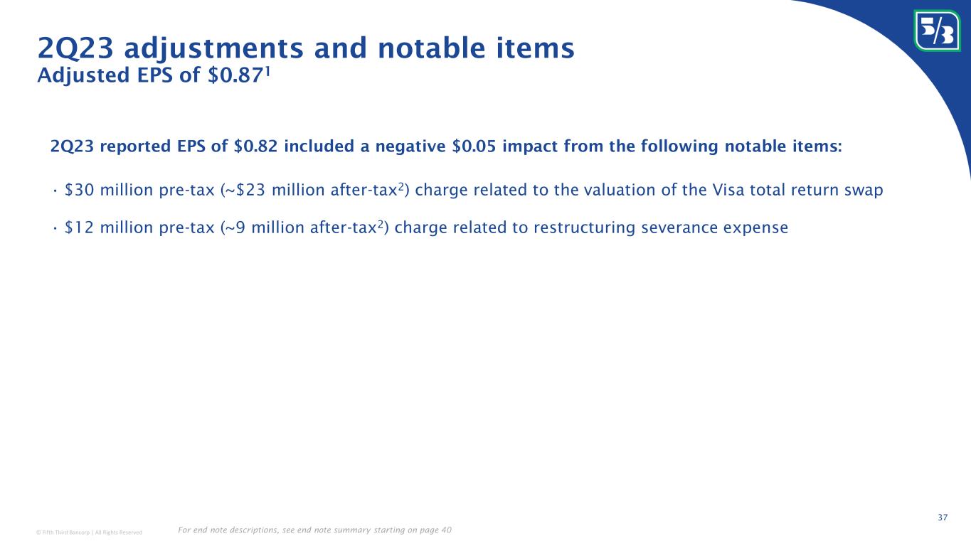 © Fifth Third Bancorp | All Rights Reserved 2Q23 adjustments and notable items Adjusted EPS of $0.87 1 2Q23 reported EPS of $0.82 included a negative $0.05 impact from the following notable items: • $30 million pre-tax (~$23 million after-tax 2 ) charge related to the valuation of the Visa total return swap • $12 million pre-tax (~9 million after-tax 2 ) charge related to restructuring severance expense For end note descriptions, see end note summary starting on page 40 37