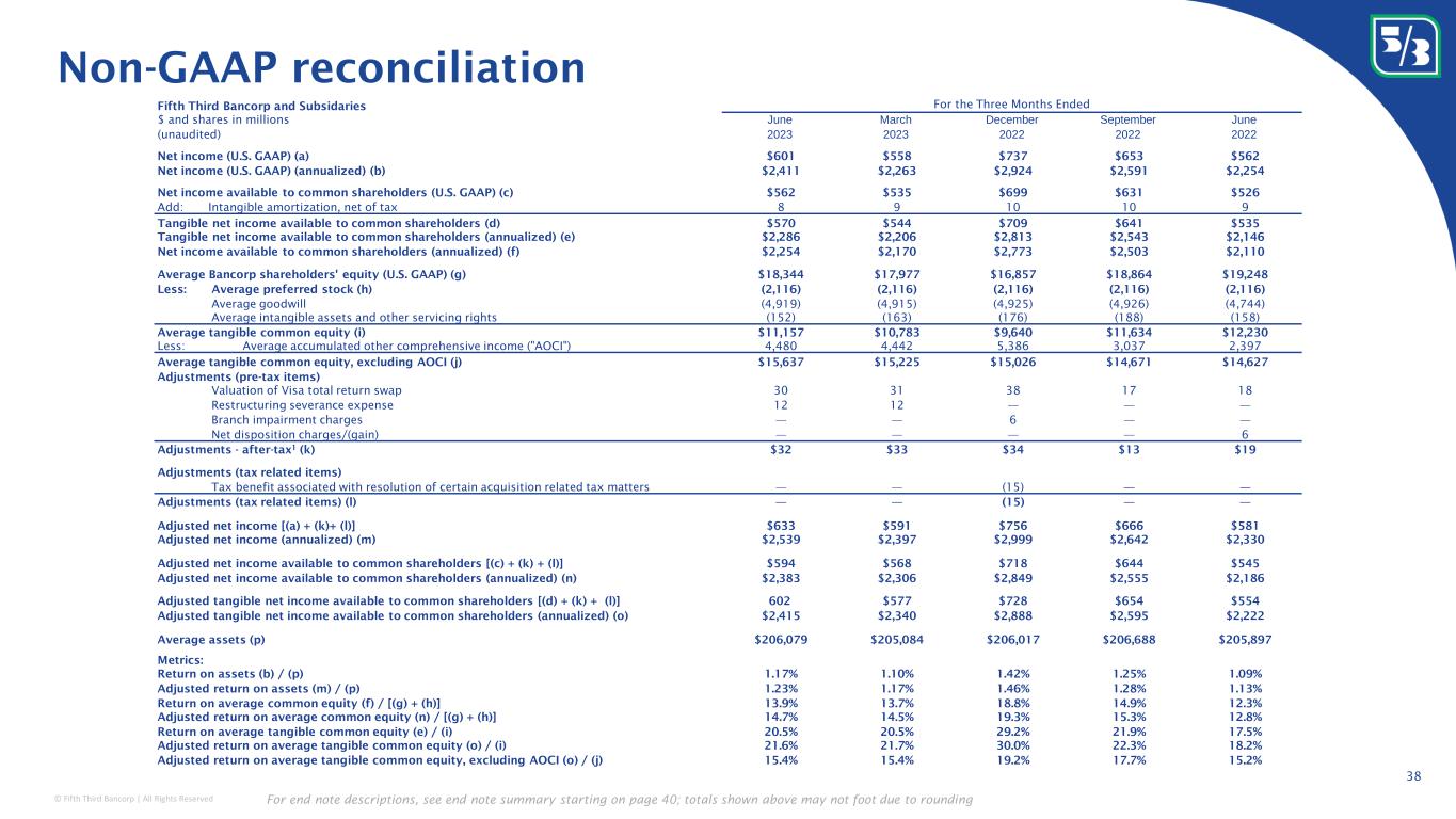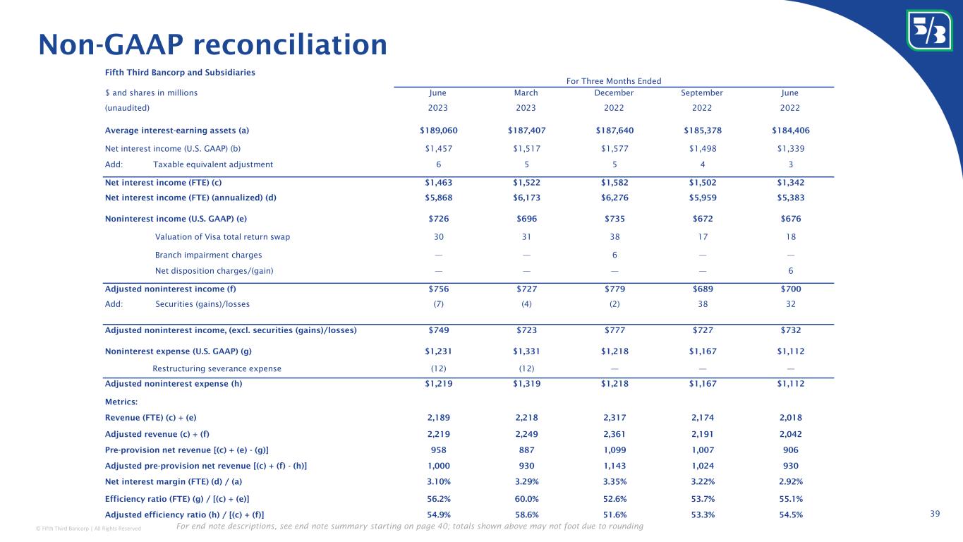 © Fifth Third Bancorp | All Rights Reserved For end note descriptions, see end note summary starting on page 40; totals shown above may not foot due to rounding 38 Fifth Third Bancorp and Subsidaries For the Three Months Ended $ and shares in millions June March December September June (unaudited) 2023 2023 2022 2022 2022 Net income (U.S. GAAP) (a) $601 $558 $737 $653 $562 Net income (U.S. GAAP) (annualized) (b) $2,411 $2,263 $2,924 $2,591 $2,254 Net income available to common shareholders (U.S. GAAP) (c) $562 $535 $699 $631 $526 Add: Intangible amortization, net of tax 8 9 10 10 9 Tangible net income available to common shareholders (d) $570 $544 $709 $641 $535 Tangible net income available to common shareholders (annualized) (e) $2,286 $2,206 $2,813 $2,543 $2,146 Net income available to common shareholders (annualized) (f) $2,254 $2,170 $2,773 $2,503 $2,110 Average Bancorp shareholders' equity (U.S. GAAP) (g) $18,344 $17,977 $16,857 $18,864 $19,248 Less: Average preferred stock (h) (2,116) (2,116) (2,116) (2,116) (2,116) Average goodwill (4,919) (4,915) (4,925) (4,926) (4,744) Average intangible assets and other servicing rights (152) (163) (176) (188) (158) Average tangible common equity (i) $11,157 $10,783 $9,640 $11,634 $12,230 Less: Average accumulated other comprehensive income ("AOCI") 4,480 4,442 5,386 3,037 2,397 Average tangible common equity, excluding AOCI (j) $15,637 $15,225 $15,026 $14,671 $14,627 Adjustments (pre-tax items) Valuation of Visa total return swap 30 31 38 17 18 Restructuring severance expense 12 12 — — — Branch impairment charges — — 6 — — Net disposition charges/(gain) — — — — 6 Adjustments - after-tax 1 (k) $32 $33 $34 $13 $19 Adjustments (tax related items) Tax benefit associated with resolution of certain acquisition related tax matters — — (15) — — Adjustments (tax related items) (l) — — (15) — — Adjusted net income [(a) + (k)+ (l)] $633 $591 $756 $666 $581 Adjusted net income (annualized) (m) $2,539 $2,397 $2,999 $2,642 $2,330 Adjusted net income available to common shareholders [(c) + (k) + (l)] $594 $568 $718 $644 $545 Adjusted net income available to common shareholders (annualized) (n) $2,383 $2,306 $2,849 $2,555 $2,186 Adjusted tangible net income available to common shareholders [(d) + (k) + (l)] 602 $577 $728 $654 $554 Adjusted tangible net income available to common shareholders (annualized) (o) $2,415 $2,340 $2,888 $2,595 $2,222 Average assets (p) $206,079 $205,084 $206,017 $206,688 $205,897 Metrics: Return on assets (b) / (p) 1.17% 1.10% 1.42% 1.25% 1.09% Adjusted return on assets (m) / (p) 1.23% 1.17% 1.46% 1.28% 1.13% Return on average common equity (f) / [(g) + (h)] 13.9% 13.7% 18.8% 14.9% 12.3% Adjusted return on average common equity (n) / [(g) + (h)] 14.7% 14.5% 19.3% 15.3% 12.8% Return on average tangible common equity (e) / (i) 20.5% 20.5% 29.2% 21.9% 17.5% Adjusted return on average tangible common equity (o) / (i) 21.6% 21.7% 30.0% 22.3% 18.2% Adjusted return on average tangible common equity, excluding AOCI (o) / (j) 15.4% 15.4% 19.2% 17.7% 15.2% Non-GAAP reconciliation