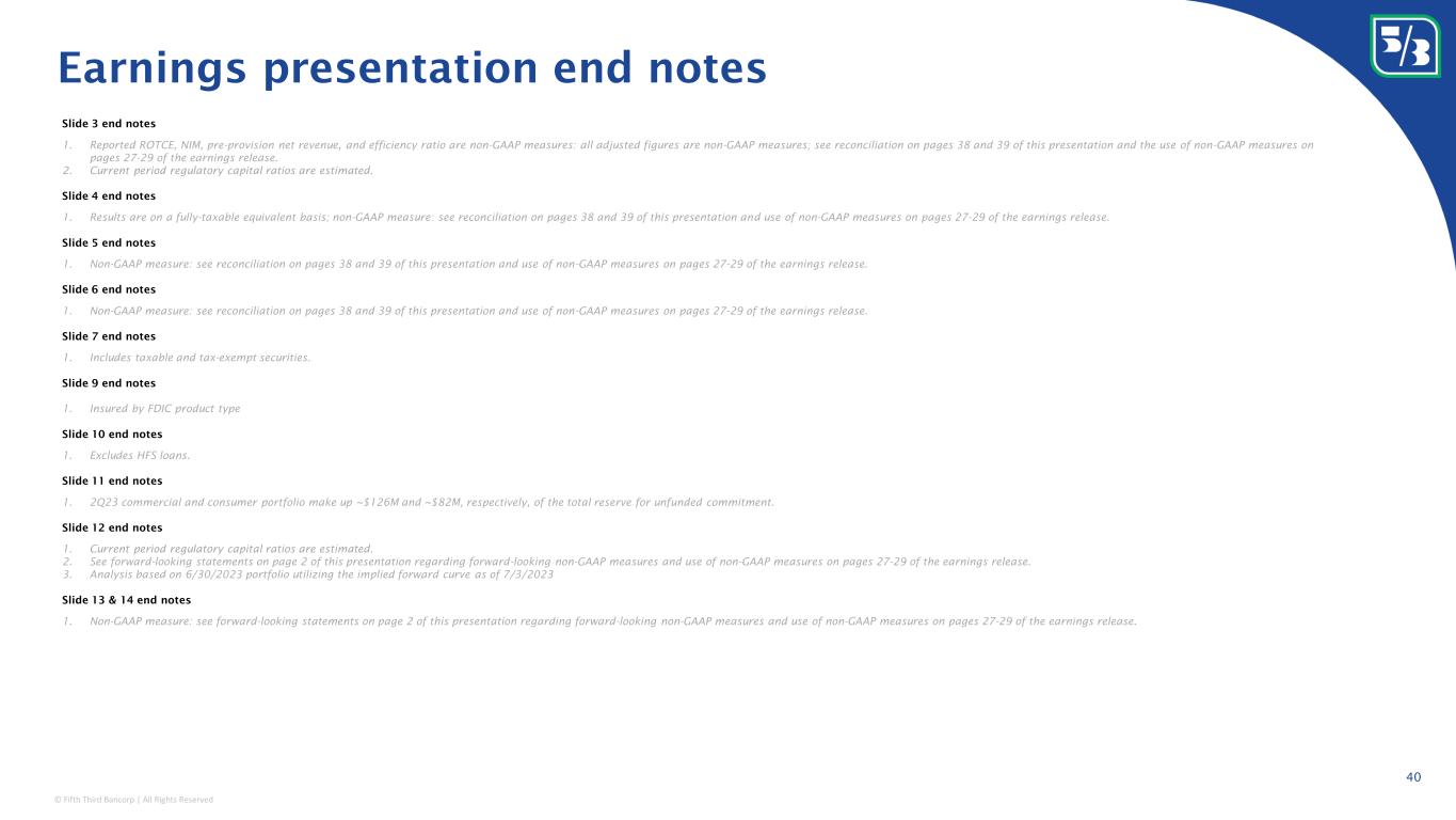 © Fifth Third Bancorp | All Rights Reserved Slide 3 end notes 1. Reported ROTCE, NIM, pre-provision net revenue, and efficiency ratio are non-GAAP measures: all adjusted figures are non-GAAP measures; see reconciliation on pages 38 and 39 of this presentation and the use of non-GAAP measures on pages 27-29 of the earnings release. 2. Current period regulatory capital ratios are estimated. Slide 4 end notes 1. Results are on a fully-taxable equivalent basis; non-GAAP measure: see reconciliation on pages 38 and 39 of this presentation and use of non-GAAP measures on pages 27-29 of the earnings release. Slide 5 end notes 1. Non-GAAP measure: see reconciliation on pages 38 and 39 of this presentation and use of non-GAAP measures on pages 27-29 of the earnings release. Slide 6 end notes 1. Non-GAAP measure: see reconciliation on pages 38 and 39 of this presentation and use of non-GAAP measures on pages 27-29 of the earnings release. Slide 7 end notes 1. Includes taxable and tax-exempt securities. Slide 9 end notes 1. Insured by FDIC product type Slide 10 end notes 1. Excludes HFS loans. Slide 11 end notes 1. 2Q23 commercial and consumer portfolio make up ~$126M and ~$82M, respectively, of the total reserve for unfunded commitment. Slide 12 end notes 1. Current period regulatory capital ratios are estimated. 2. See forward-looking statements on page 2 of this presentation regarding forward-looking non-GAAP measures and use of non-GAAP measures on pages 27-29 of the earnings release. 3. Analysis based on 6/30/2023 portfolio utilizing the implied forward curve as of 7/3/2023 Slide 13 & 14 end notes 1. Non-GAAP measure: see forward-looking statements on page 2 of this presentation regarding forward-looking non-GAAP measures and use of non-GAAP measures on pages 27-29 of the earnings release. 40 Earnings presentation end notes