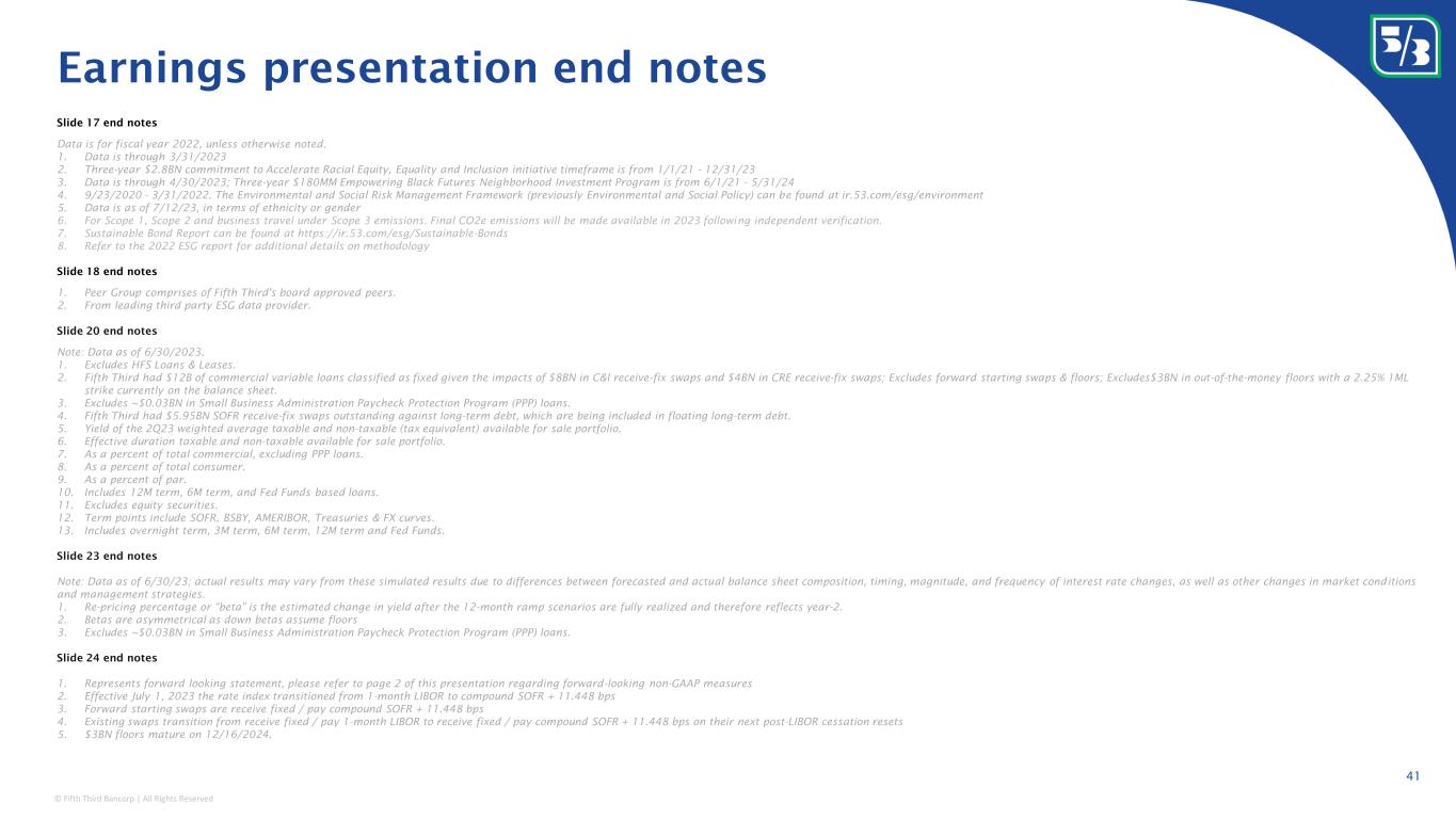 © Fifth Third Bancorp | All Rights Reserved Slide 17 end notes Data is for fiscal year 2022, unless otherwise noted. 1. Data is through 3/31/2023 2. Three-year $2.8BN commitment to Accelerate Racial Equity, Equality and Inclusion initiative timeframe is from 1/1/21 - 12/31/23 3. Data is through 4/30/2023; Three-year $180MM Empowering Black Futures Neighborhood Investment Program is from 6/1/21 - 5/31/24 4. 9/23/2020 - 3/31/2022. The Environmental and Social Risk Management Framework (previously Environmental and Social Policy) can be found at ir.53.com/esg/environment 5. Data is as of 7/12/23, in terms of ethnicity or gender 6. For Scope 1, Scope 2 and business travel under Scope 3 emissions. Final CO2e emissions will be made available in 2023 following independent verification. 7. Sustainable Bond Report can be found at https://ir.53.com/esg/Sustainable-Bonds 8. Refer to the 2022 ESG report for additional details on methodology Slide 18 end notes 1. Peer Group comprises of Fifth Third's board approved peers. 2. From leading third party ESG data provider. Slide 20 end notes Note: Data as of 6/30/2023. 1. Excludes HFS Loans & Leases. 2. Fifth Third had $12B of commercial variable loans classified as fixed given the impacts of $8BN in C&I receive-fix swaps and $4BN in CRE receive-fix swaps; Excludes forward starting swaps & floors; Excludes$3BN in out-of-the-money floors with a 2.25% 1ML strike currently on the balance sheet. 3. Excludes ~$0.03BN in Small Business Administration Paycheck Protection Program (PPP) loans. 4. Fifth Third had $5.95BN SOFR receive-fix swaps outstanding against long-term debt, which are being included in floating long-term debt. 5. Yield of the 2Q23 weighted average taxable and non-taxable (tax equivalent) available for sale portfolio. 6. Effective duration taxable and non-taxable available for sale portfolio. 7. As a percent of total commercial, excluding PPP loans. 8. As a percent of total consumer. 9. As a percent of par. 10. Includes 12M term, 6M term, and Fed Funds based loans. 11. Excludes equity securities. 12. Term points include SOFR, BSBY, AMERIBOR, Treasuries & FX curves. 13. Includes overnight term, 3M term, 6M term, 12M term and Fed Funds. Slide 23 end notes Note: Data as of 6/30/23; actual results may vary from these simulated results due to differences between forecasted and actual balance sheet composition, timing, magnitude, and frequency of interest rate changes, as well as other changes in market conditions and management strategies. 1. Re-pricing percentage or “beta” is the estimated change in yield after the 12-month ramp scenarios are fully realized and therefore reflects year-2. 2. Betas are asymmetrical as down betas assume floors 3. Excludes ~$0.03BN in Small Business Administration Paycheck Protection Program (PPP) loans. Slide 24 end notes 1. Represents forward looking statement, please refer to page 2 of this presentation regarding forward-looking non-GAAP measures 2. Effective July 1, 2023 the rate index transitioned from 1-month LIBOR to compound SOFR + 11.448 bps 3. Forward starting swaps are receive fixed / pay compound SOFR + 11.448 bps 4. Existing swaps transition from receive fixed / pay 1-month LIBOR to receive fixed / pay compound SOFR + 11.448 bps on their next post-LIBOR cessation resets 5. $3BN floors mature on 12/16/2024. Earnings presentation end notes 41