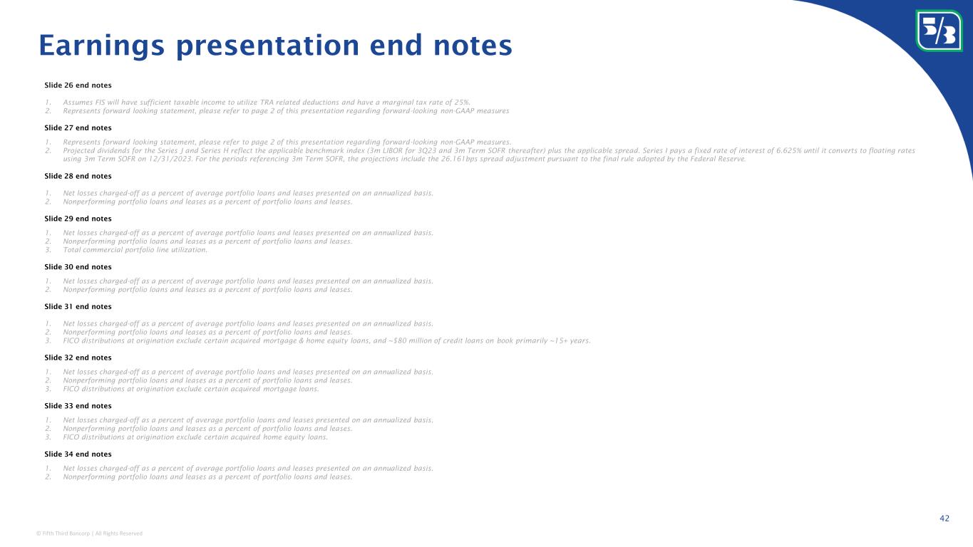 © Fifth Third Bancorp | All Rights Reserved Slide 26 end notes 1. Assumes FIS will have sufficient taxable income to utilize TRA related deductions and have a marginal tax rate of 25%. 2. Represents forward looking statement, please refer to page 2 of this presentation regarding forward-looking non-GAAP measures Slide 27 end notes 1. Represents forward looking statement, please refer to page 2 of this presentation regarding forward-looking non-GAAP measures. 2. Projected dividends for the Series J and Series H reflect the applicable benchmark index (3m LIBOR for 3Q23 and 3m Term SOFR thereafter) plus the applicable spread. Series I pays a fixed rate of interest of 6.625% until it converts to floating rates using 3m Term SOFR on 12/31/2023. For the periods referencing 3m Term SOFR, the projections include the 26.161bps spread adjustment pursuant to the final rule adopted by the Federal Reserve. Slide 28 end notes 1. Net losses charged-off as a percent of average portfolio loans and leases presented on an annualized basis. 2. Nonperforming portfolio loans and leases as a percent of portfolio loans and leases. Slide 29 end notes 1. Net losses charged-off as a percent of average portfolio loans and leases presented on an annualized basis. 2. Nonperforming portfolio loans and leases as a percent of portfolio loans and leases. 3. Total commercial portfolio line utilization. Slide 30 end notes 1. Net losses charged-off as a percent of average portfolio loans and leases presented on an annualized basis. 2. Nonperforming portfolio loans and leases as a percent of portfolio loans and leases. Slide 31 end notes 1. Net losses charged-off as a percent of average portfolio loans and leases presented on an annualized basis. 2. Nonperforming portfolio loans and leases as a percent of portfolio loans and leases. 3. FICO distributions at origination exclude certain acquired mortgage & home equity loans, and ~$80 million of credit loans on book primarily ~15+ years. Slide 32 end notes 1. Net losses charged-off as a percent of average portfolio loans and leases presented on an annualized basis. 2. Nonperforming portfolio loans and leases as a percent of portfolio loans and leases. 3. FICO distributions at origination exclude certain acquired mortgage loans. Slide 33 end notes 1. Net losses charged-off as a percent of average portfolio loans and leases presented on an annualized basis. 2. Nonperforming portfolio loans and leases as a percent of portfolio loans and leases. 3. FICO distributions at origination exclude certain acquired home equity loans. Slide 34 end notes 1. Net losses charged-off as a percent of average portfolio loans and leases presented on an annualized basis. 2. Nonperforming portfolio loans and leases as a percent of portfolio loans and leases. 42 Earnings presentation end notes
