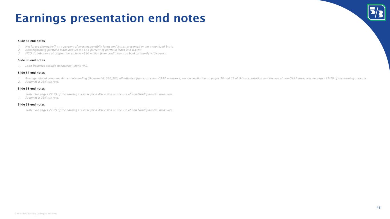 © Fifth Third Bancorp | All Rights Reserved Slide 35 end notes 1. Net losses charged-off as a percent of average portfolio loans and leases presented on an annualized basis. 2. Nonperforming portfolio loans and leases as a percent of portfolio loans and leases. 3. FICO distributions at origination exclude ~$80 million from credit loans on book primarily ~15+ years. Slide 36 end notes 1. Loan balances exclude nonaccrual loans HFS. Slide 37 end notes 1. Average diluted common shares outstanding (thousands); 686,386; all adjusted figures are non-GAAP measures; see reconciliation on pages 38 and 39 of this presentation and the use of non-GAAP measures on pages 27-29 of the earnings release. 2. Assumes a 23% tax rate. Slide 38 end notes Note: See pages 27-29 of the earnings release for a discussion on the use of non-GAAP financial measures. 1. Assumes a 23% tax rate. Slide 39 end notes Note: See pages 27-29 of the earnings release for a discussion on the use of non-GAAP financial measures. 43 Earnings presentation end notes