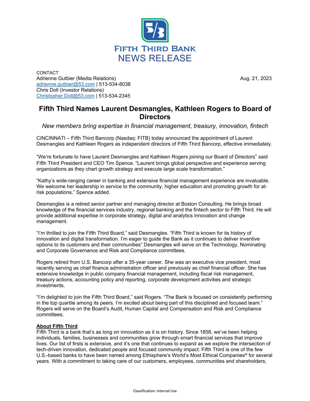 NEWS RELEASE Classification: Internal Use CONTACT Adrienne Gutbier (Media Relations) Aug. 21, 2023 adrienne.gutbier@53.com | 513-534-8038 Chris Doll (Investor Relations) Christopher.Doll@53.com | 513-534-2345 Fifth Third Names Laurent Desmangles, Kathleen Rogers to Board of Directors New members bring expertise in financial management, treasury, innovation, fintech CINCINNATI – Fifth Third Bancorp (Nasdaq: FITB) today announced the appointment of Laurent Desmangles and Kathleen Rogers as independent directors of Fifth Third Bancorp, effective immediately. “We’re fortunate to have Laurent Desmangles and Kathleen Rogers joining our Board of Directors” said Fifth Third President and CEO Tim Spence. “Laurent brings global perspective and experience serving organizations as they chart growth strategy and execute large scale transformation.” “Kathy’s wide-ranging career in banking and extensive financial management experience are invaluable. We welcome her leadership in service to the community, higher education and promoting growth for at- risk populations,” Spence added. Desmangles is a retired senior partner and managing director at Boston Consulting. He brings broad knowledge of the financial services industry, regional banking and the fintech sector to Fifth Third. He will provide additional expertise in corporate strategy, digital and analytics innovation and change management. “I’m thrilled to join the Fifth Third Board,” said Desmangles. “Fifth Third is known for its history of innovation and digital transformation. I’m eager to guide the Bank as it continues to deliver inventive options to its customers and their communities” Desmangles will serve on the Technology, Nominating and Corporate Governance and Risk and Compliance committees. Rogers retired from U.S. Bancorp after a 35-year career. She was an executive vice president, most recently serving as chief finance administration officer and previously as chief financial officer. She has extensive knowledge in public company financial management, including fiscal risk management, treasury actions, accounting policy and reporting, corporate development activities and strategic investments. “I’m delighted to join the Fifth Third Board,” said Rogers. “The Bank is focused on consistently performing in the top quartile among its peers. I’m excited about being part of this disciplined and focused team.” Rogers will serve on the Board’s Audit, Human Capital and Compensation and Risk and Compliance committees. About Fifth Third Fifth Third is a bank that’s as long on innovation as it is on history. Since 1858, we’ve been helping individuals, families, businesses and communities grow through smart financial services that improve lives. Our list of firsts is extensive, and it’s one that continues to expand as we explore the intersection of tech-driven innovation, dedicated people and focused community impact. Fifth Third is one of the few U.S.-based banks to have been named among Ethisphere’s World’s Most Ethical Companies® for several years. With a commitment to taking care of our customers, employees, communities and shareholders,
