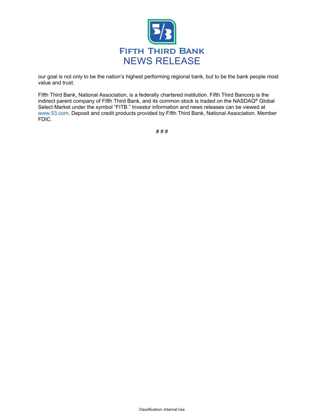 NEWS RELEASE Classification: Internal Use our goal is not only to be the nation’s highest performing regional bank, but to be the bank people most value and trust. Fifth Third Bank, National Association, is a federally chartered institution. Fifth Third Bancorp is the indirect parent company of Fifth Third Bank, and its common stock is traded on the NASDAQ® Global Select Market under the symbol “FITB.” Investor information and news releases can be viewed at www.53.com. Deposit and credit products provided by Fifth Third Bank, National Association. Member FDIC. # # #