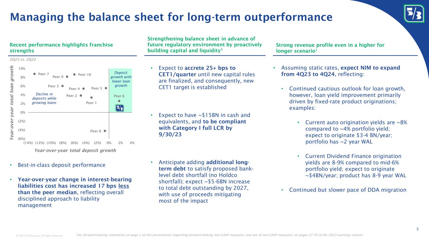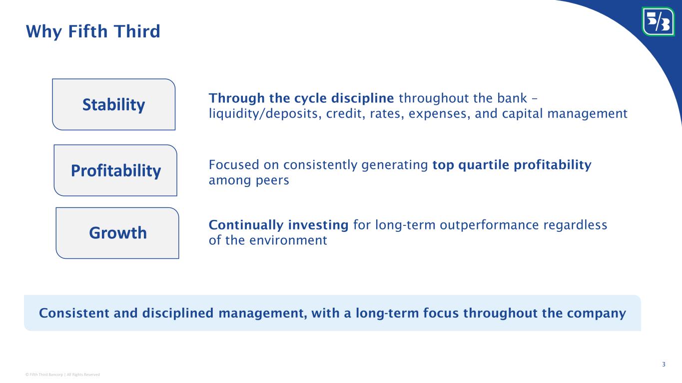 © Fifth Third Bancorp | All Rights Reserved This presentation contains statements that we believe are “forward-looking statements” within the meaning of Section 27A of the Securities Act of 1933, as amended, and Rule 175 promulgated thereunder, and Section 21E of the Securities Exchange Act of 1934, as amended, and Rule 3b-6 promulgated thereunder. All statements other than statements of historical fact are forward-looking statements. These statements relate to our financial condition, results of operations, plans, objectives, future performance, capital actions or business. They usually can be identified by the use of forward-looking language such as “will likely result,” “may,” “are expected to,” “is anticipated,” “potential,” “estimate,” “forecast,” “projected,” “intends to,” or may include other similar words or phrases such as “believes,” “plans,” “trend,” “objective,” “continue,” “remain,” or similar expressions, or future or conditional verbs such as “will,” “would,” “should,” “could,” “might,” “can,” or similar verbs. You should not place undue reliance on these statements, as they are subject to risks and uncertainties, including but not limited to the risk factors set forth in our most recent Annual Report on Form 10-K as updated by our filings with the U.S. Securities and Exchange Commission (“SEC”). There are a number of important factors that could cause future results to differ materially from historical performance and these forward-looking statements. Factors that might cause such a difference include, but are not limited to: (1) effects of the global COVID-19 pandemic; (2) deteriorating credit quality; (3) loan concentration by location or industry of borrowers or collateral; (4) problems encountered by other financial institutions; (5) inadequate sources of funding or liquidity; (6) unfavorable actions of rating agencies; (7) inability to maintain or grow deposits; (8) limitations on the ability to receive dividends from subsidiaries; (9) cyber-security risks; (10) Fifth Third’s ability to secure confidential information and deliver products and services through the use of computer systems and telecommunications networks; (11) failures by third-party service providers; (12) inability to manage strategic initiatives and/or organizational changes; (13) inability to implement technology system enhancements; (14) failure of internal controls and other risk management systems; (15) losses related to fraud, theft, misappropriation or violence; (16) inability to attract and retain skilled personnel; (17) adverse impacts of government regulation; (18) governmental or regulatory changes or other actions; (19) failures to meet applicable capital requirements; (20) regulatory objections to Fifth Third’s capital plan; (21) regulation of Fifth Third’s derivatives activities; (22) deposit insurance premiums; (23) assessments for the orderly liquidation fund; (24) replacement of LIBOR; (25) weakness in the national or local economies; (26) global political and economic uncertainty or negative actions; (27) changes in interest rates and the effects of inflation; (28) changes and trends in capital markets; (29) fluctuation of Fifth Third’s stock price; (30) volatility in mortgage banking revenue; (31) litigation, investigations, and enforcement proceedings by governmental authorities; (32) breaches of contractual covenants, representations and warranties; (33) competition and changes in the financial services industry; (34) changing retail distribution strategies, customer preferences and behavior; (35) difficulties in identifying, acquiring or integrating suitable strategic partnerships, investments or acquisitions; (36) potential dilution from future acquisitions; (37) loss of income and/or difficulties encountered in the sale and separation of businesses, investments or other assets; (38) results of investments or acquired entities; (39) changes in accounting standards or interpretation or declines in the value of Fifth Third’s goodwill or other intangible assets; (40) inaccuracies or other failures from the use of models; (41) effects of critical accounting policies and judgments or the use of inaccurate estimates; (42) weather-related events, other natural disasters, or health emergencies (including pandemics); (43) the impact of reputational risk created by these or other developments on such matters as business generation and retention, funding and liquidity; (44) changes in law or requirements imposed by Fifth Third’s regulators impacting our capital actions, including dividend payments and stock repurchases; and (45) Fifth Third's ability to meet its environmental and/or social targets, goals and commitments. You should refer to our periodic and current reports filed with the Securities and Exchange Commission, or “SEC,” for further information on other factors, which could cause actual results to be significantly different from those expressed or implied by these forward-looking statements. Moreover, you should treat these statements as speaking only as of the date they are made and based only on information then actually known to us. We expressly disclaim any obligation or undertaking to release publicly any updates or revisions to any forward-looking statements contained herein to reflect any change in our expectations or any changes in events, conditions or circumstances on which any such statement is based, except as may be required by law, and we claim the protection of the safe harbor for forward-looking statements contained in the Private Securities Litigation Reform Act of 1995. The information contained herein is intended to be reviewed in its totality, and any stipulations, conditions or provisos that apply to a given piece of information in one part of this press release should be read as applying mutatis mutandis to every other instance of such information a