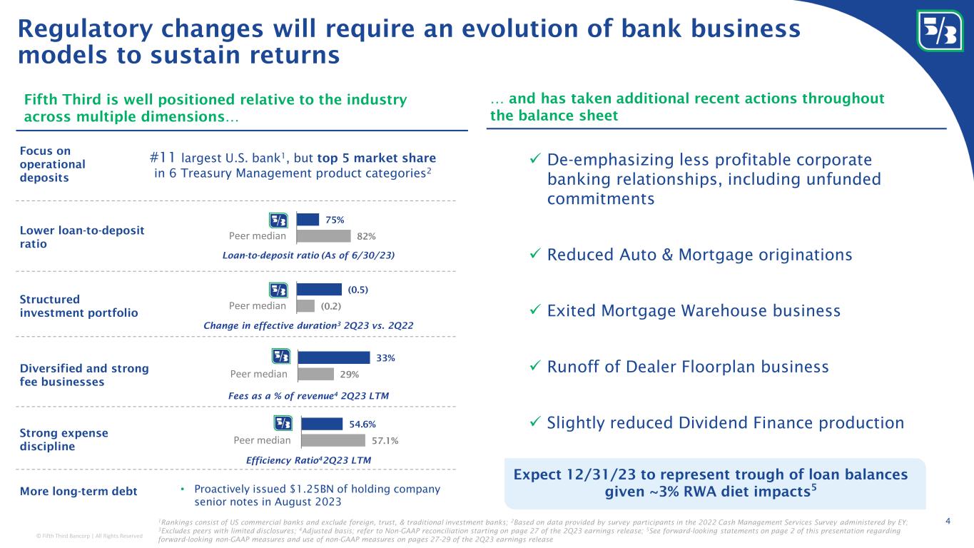 © Fifth Third Bancorp | All Rights Reserved Change in effective duration 3 2Q23 vs. 2Q22 Fifth Third is well positioned relative to the industry across multiple dimensions… Regulatory changes will require an evolution of bank business models to sustain returns 41 Rankings consist of US commercial banks and exclude foreign, trust, & traditional investment banks; 2 Based on data provided by survey participants in the 2022 Cash Management Services Survey administered by EY; 3 Excludes peers with limited disclosures; 4 Adjusted basis; refer to Non-GAAP reconciliation starting on page 27 of the 2Q23 earnings release; 5 See forward-looking statements on page 2 of this presentation regarding forward-looking non-GAAP measures and use of non-GAAP measures on pages 27-29 of the 2Q23 earnings release Expect 12/31/23 to represent trough of loan balances given ~3% RWA diet impacts 5 … and has taken additional recent actions throughout the balance sheet ✓ De-emphasizing less profitable corporate banking relationships, including unfunded commitments ✓ Reduced Auto & Mortgage originations ✓ Exited Mortgage Warehouse business ✓ Runoff of Dealer Floorplan business ✓ Slightly reduced Dividend Finance production Strong expense discipline Diversified and strong fee businesses Focus on operational deposits Structured investment portfolio More long-term debt Lower loan-to-deposit ratio 82% 75% Peer median X 29% 33% Peer median X 57.1% 54.6% Peer median X Efficiency Ratio 4 2Q23 LTM Fees as a % of revenue 4 2Q23 LTM Loan-to-deposit ratio (As of 6/30/23) • Proactively issued $1.25BN of holding company senior notes in August 2023 (0.2) (0.5) Peer median X #11 largest U.S. bank 1 , but top 5 market share in 6 Treasury Management product categories 2