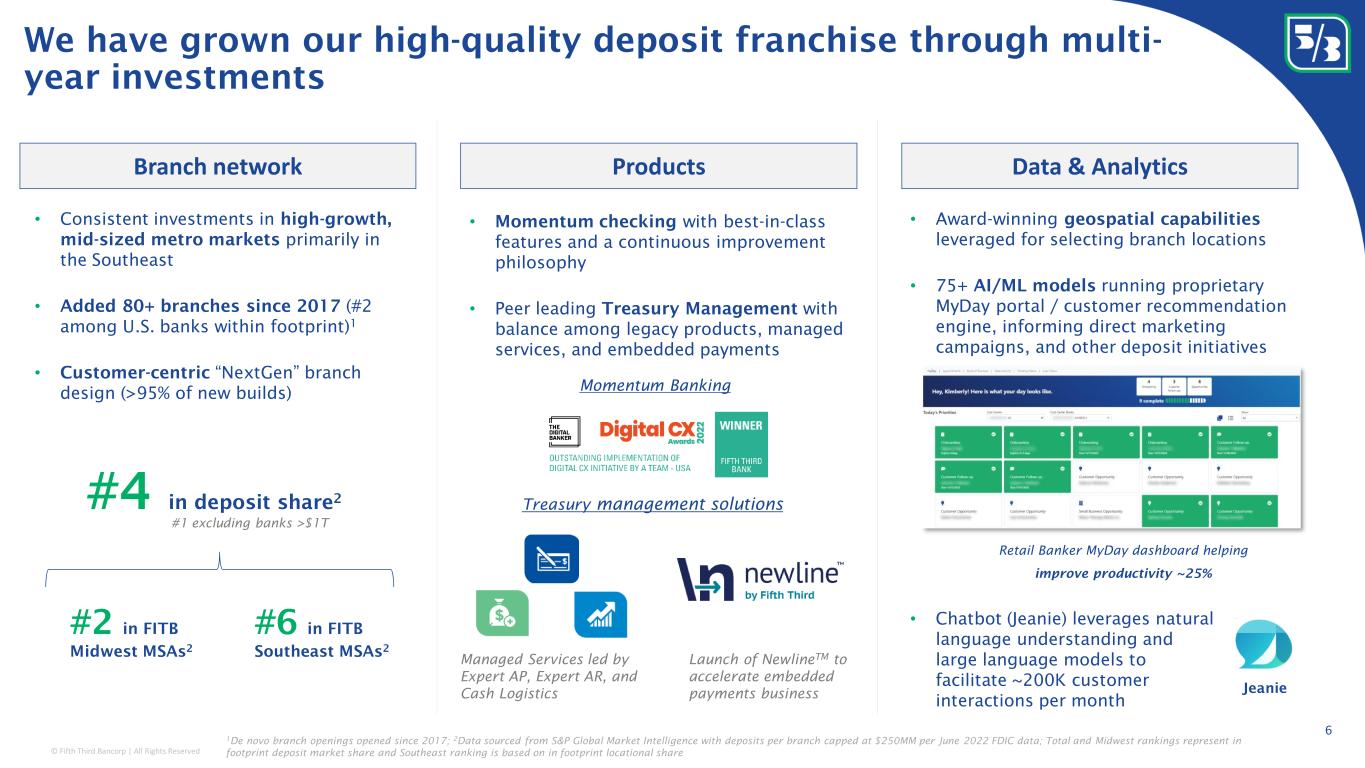 © Fifth Third Bancorp | All Rights Reserved Peer 1 Peer 2 Peer 3 Peer 4 Peer 5 Peer 6 Peer 7 Peer 8 Peer 9 Peer 10 (6%) (4%) (2%) 0% 2% 4% 6% 8% 10% (14%) (12%) (10%) (8%) (6%) (4%) (2%) 0% 2% 4% Managing the balance sheet for long-term outperformance 5 Recent performance highlights franchise strengths Strengthening balance sheet in advance of future regulatory environment by proactively building capital and liquidity 1 Strong revenue profile even in a higher for longer scenario 1 • Best-in-class deposit performance • Year-over-year change in interest-bearing liabilities cost has increased 17 bps less than the peer median, reflecting overall disciplined approach to liability management • Expect to accrete 25+ bps to CET1/quarter until new capital rules are finalized, and consequently, new CET1 target is established • Expect to have ~$15BN in cash and equivalents, and to be compliant with Category I full LCR by 9/30/23 • Anticipate adding additional long- term debt to satisfy proposed bank- level debt shortfall (no Holdco shortfall); expect ~$5-6BN increase to total debt outstanding by 2027, with use of proceeds mitigating most of the impact • Assuming static rates, expect NIM to expand from 4Q23 to 4Q24, reflecting: • Continued cautious outlook for loan growth, however, loan yield improvement primarily driven by fixed-rate product originations; examples: • Current auto origination yields are ~8% compared to ~4% portfolio yield; expect to originate $3-4 BN/year; portfolio has ~2 year WAL • Current Dividend Finance origination yields are 8-9% compared to mid-6% portfolio yield; expect to originate ~$4BN/year; product has 8-9 year WAL • Continued but slower pace of DDA migration Year-over-year total deposit growth Y e a r - o v e r - y e a r t o t a l l o a n g r o w t h Deposit growth with lower loan growth Decline in deposits while growing loans 2Q23 vs. 2Q22 1 See forward-looking statements on page 2 of this presentation regarding forward-looking non-GAAP measures and use of non-GAAP measures on pages 27-29 of the 2Q23 earnings release