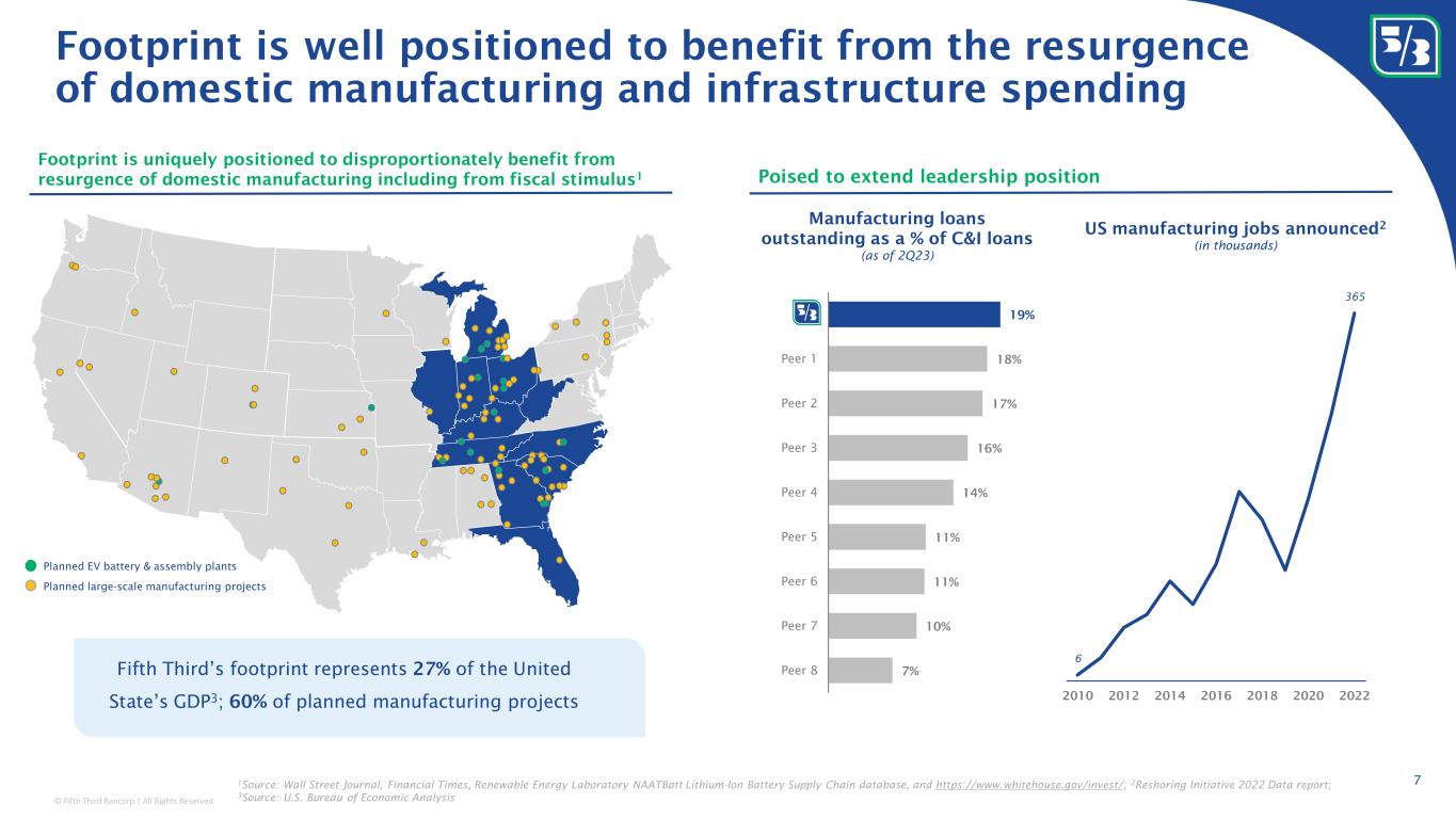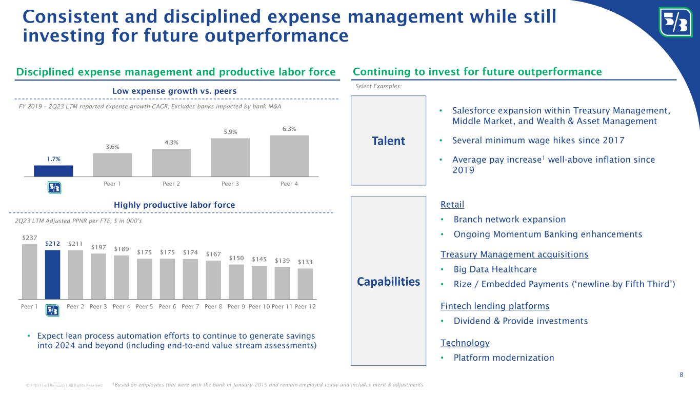 © Fifth Third Bancorp | All Rights Reserved Footprint is well positioned to benefit from the resurgence of domestic manufacturing and infrastructure spending 1 Source: Wall Street Journal, Financial Times, Renewable Energy Laboratory NAATBatt Lithium-Ion Battery Supply Chain database, and https://www.whitehouse.gov/invest/; 2 Reshoring Initiative 2022 Data report; 3 Source: U.S. Bureau of Economic Analysis 7 Poised to extend leadership position US manufacturing jobs announced 2 (in thousands) 7% 10% 11% 11% 14% 16% 17% 18% 19% Peer 8 Peer 7 Peer 6 Peer 5 Peer 4 Peer 3 Peer 2 Peer 1 FITB Manufacturing loans outstanding as a % of C&I loans (as of 2Q23) 6 365 2010 2012 2014 2016 2018 2020 2022 Footprint is uniquely positioned to disproportionately benefit from resurgence of domestic manufacturing including from fiscal stimulus 1 Fifth Third’s footprint represents 27% of the United State’s GDP 3 ; 60% of planned manufacturing projects Planned EV battery & assembly plants Planned large-scale manufacturing projects