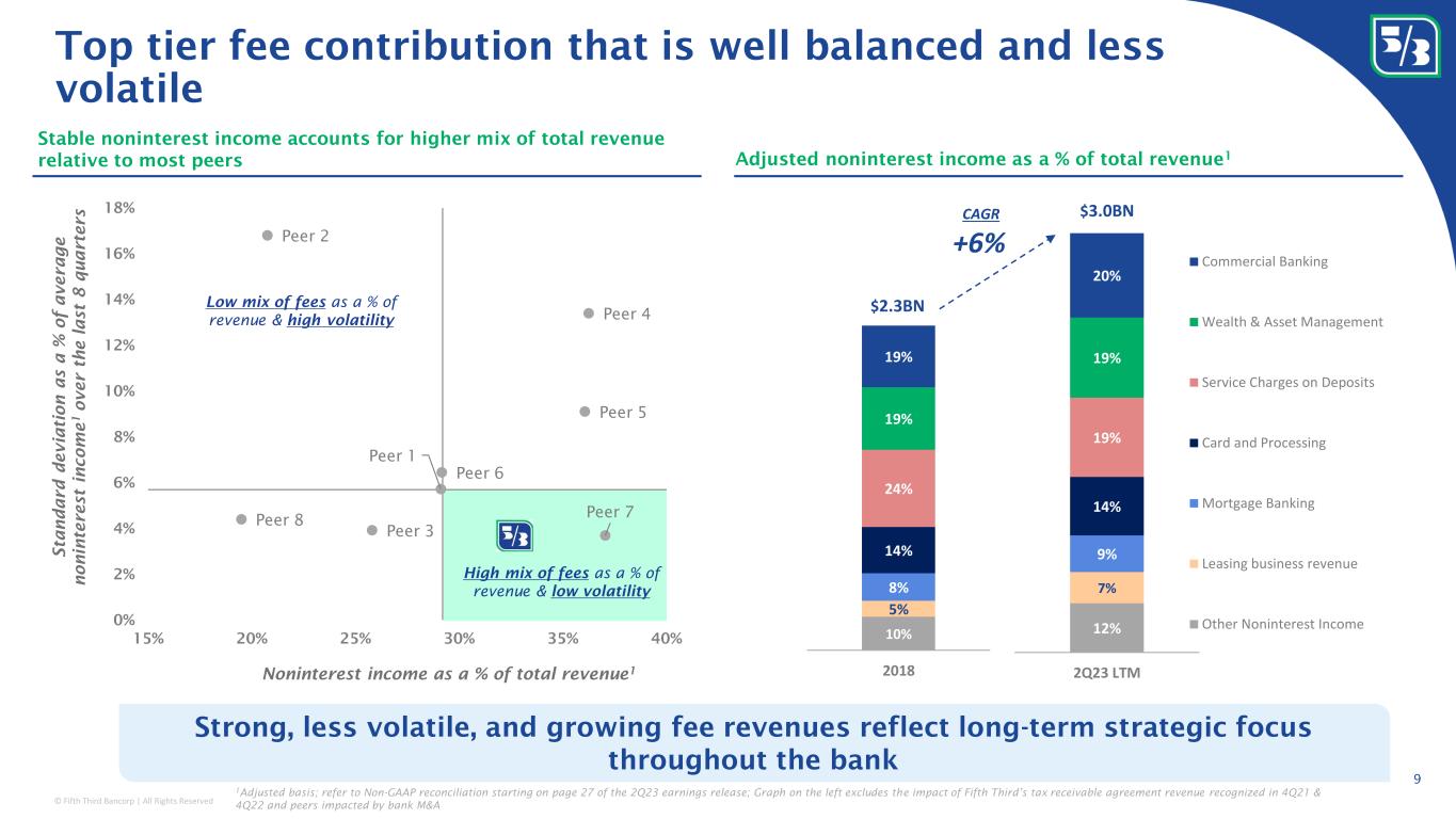 © Fifth Third Bancorp | All Rights Reserved Retail • Branch network expansion • Ongoing Momentum Banking enhancements Treasury Management acquisitions • Big Data Healthcare • Rize / Embedded Payments (‘newline by Fifth Third’) Fintech lending platforms • Dividend & Provide investments Technology • Platform modernization $237 $212 $211 $197 $189 $175 $175 $174 $167 $150 $145 $139 $133 Peer 1 x Peer 2 Peer 3 Peer 4 Peer 5 Peer 6 Peer 7 Peer 8 Peer 9 Peer 10 Peer 11 Peer 12 1.7% 3.6% 4.3% 5.9% 6.3% x Peer 1 Peer 2 Peer 3 Peer 4 8 Disciplined expense management and productive labor force 1 Based on employees that were with the bank in January 2019 and remain employed today and includes merit & adjustments Consistent and disciplined expense management while still investing for future outperformance Continuing to invest for future outperformance 2Q23 LTM Adjusted PPNR per FTE; $ in 000’s FY 2019 – 2Q23 LTM reported expense growth CAGR; Excludes banks impacted by bank M&A • Expect lean process automation efforts to continue to generate savings into 2024 and beyond (including end-to-end value stream assessments) Low expense growth vs. peers • Salesforce expansion within Treasury Management, Middle Market, and Wealth & Asset Management • Several minimum wage hikes since 2017 • Average pay increase 1 well-above inflation since 2019 Highly productive labor force Talent Capabilities Select Examples: