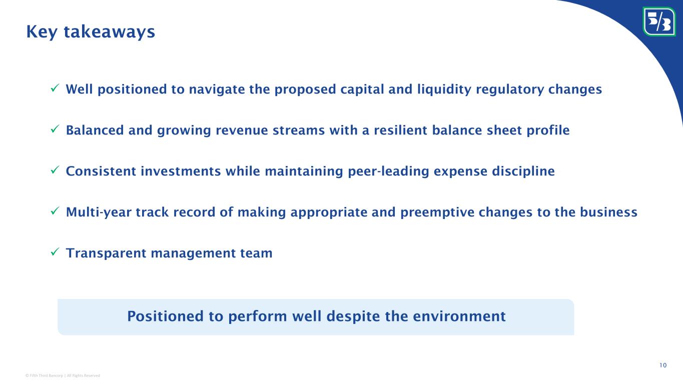 © Fifth Third Bancorp | All Rights Reserved Peer 1 Peer 2 Peer 3 Peer 4 Peer 5 Peer 6 Peer 7 Peer 8 0% 2% 4% 6% 8% 10% 12% 14% 16% 18% 15% 20% 25% 30% 35% 40% Top tier fee contribution that is well balanced and less volatile Stable noninterest income accounts for higher mix of total revenue relative to most peers 10% 5% 8% 14% 24% 19% 19% 2018 +6% $2.3BN $3.0BN 12% 7% 9% 14% 19% 19% 20% 2Q23 LTM Commercial Banking Wealth & Asset Management Service Charges on Deposits Card and Processing Mortgage Banking Leasing business revenue Other Noninterest Income CAGR Noninterest income as a % of total revenue 1 Adjusted noninterest income as a % of total revenue 1 Strong, less volatile, and growing fee revenues reflect long-term strategic focus throughout the bank S t a n d a r d d e v i a t i o n a s a % o f a v e r a g e n o n i n t e r e s t i n c o m e 1 o v e r t h e l a s t 8 q u a r t e r s 1 Adjusted basis; refer to Non-GAAP reconciliation starting on page 27 of the 2Q23 earnings release; Graph on the left excludes the impact of Fifth Third’s tax receivable agreement revenue recognized in 4Q21 & 4Q22 and peers impacted by bank M&A High mix of fees as a % of revenue & low volatility Low mix of fees as a % of revenue & high volatility 9