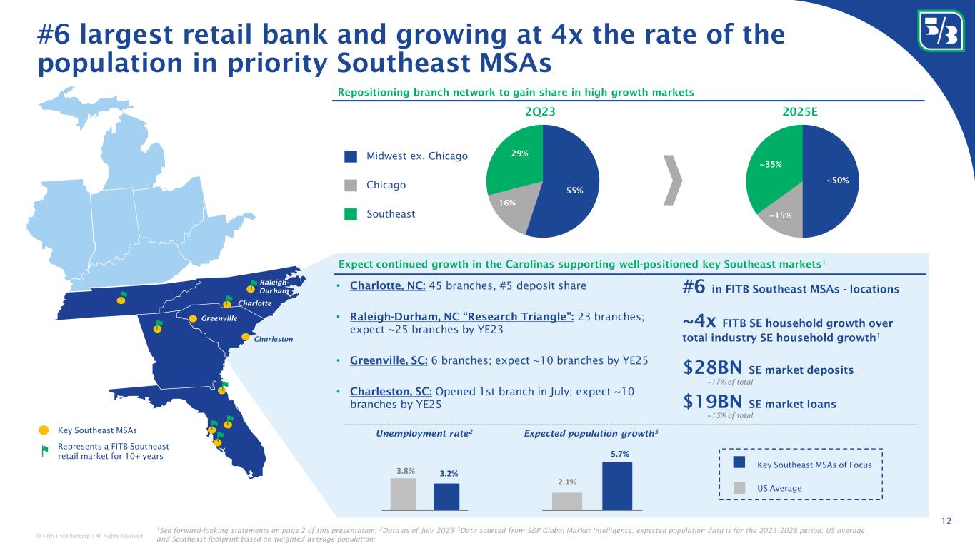 © Fifth Third Bancorp | All Rights Reserved #6 largest retail bank and growing at 4x the rate of the population in priority Southeast MSAs Key Southeast MSAs Represents a FITB Southeast retail market for 10+ years 3.8% 3.2% USA SE of F 2.1% 5.7% USA SE of F Expect continued growth in the Carolinas supporting well-positioned key Southeast markets 1 US Average Key Southeast MSAs of Focus Expected population growth 3 Unemployment rate 2 #6 in FITB Southeast MSAs - locations ~4x FITB SE household growth over total industry SE household growth 1 $28BN SE market deposits $19BN SE market loans • Charlotte, NC: 45 branches, #5 deposit share • Raleigh-Durham, NC “Research Triangle”: 23 branches; expect ~25 branches by YE23 • Greenville, SC: 6 branches; expect ~10 branches by YE25 • Charleston, SC: Opened 1st branch in July; expect ~10 branches by YE25 ~15% of total ~17% of total Repositioning branch network to gain share in high growth markets ~50% ~15% ~35% 2Q23 2025E 55% 16% 29% Midwest ex. Chicago Chicago Southeast Charlotte Raleigh- Durham Greenville Charleston 12 1 See forward-looking statements on page 2 of this presentation; 2 Data as of July 2023 ; 3 Data sourced from S&P Global Market Intelligence; expected population data is for the 2023-2028 period; US average and Southeast footprint based on weighted average population;