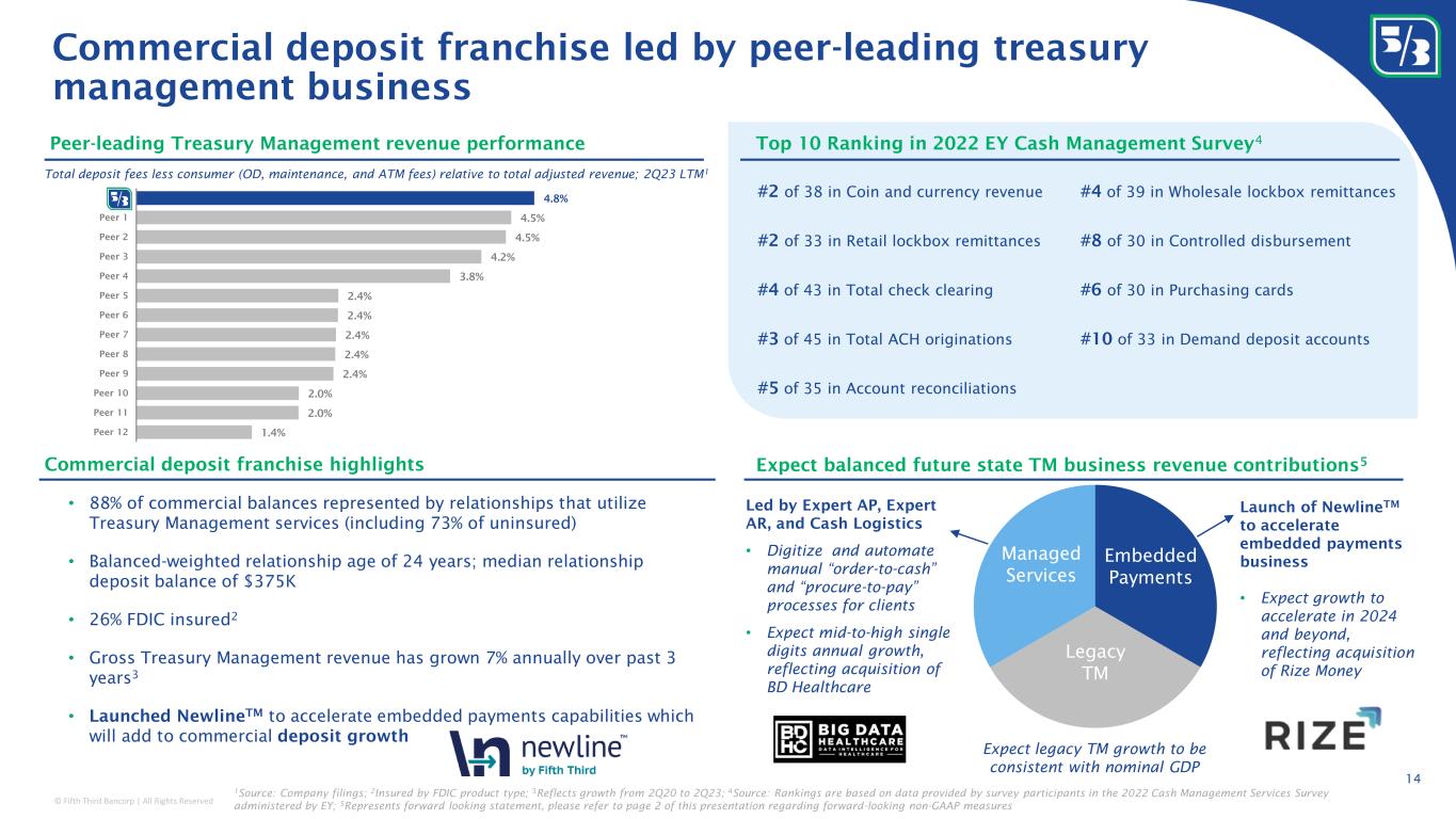 © Fifth Third Bancorp | All Rights Reserved 13 Example Fifth Third Solutions: Product innovation and development: Market leadership: • #3 residential solar national market share • #2 practice finance national market share • Top 5 market share in 6 Treasury Management product categories 1 • ~1.2 million Momentum HHs Momentum Banking Dividend Finance ProvideTreasury Management • Pioneered solar industry financing model • Proprietary digital-first platform • Focused on scaling existing products, adding Tier 1 contractor partners, synergies with Fifth Third home equity capabilities • Leading practice marketplace referral platform • Expanded to vet services • Added new financing options • ~90% of new relationships have deposits, TM, or both Customer-centric, technology-led product innovation and development 1 Based on data provided by survey participants in the 2022 Cash Management Services Survey administered by EY • First large bank to offer a fintech-equivalent everyday banking offering (2021) • Expanded Early Pay to include income from gig work, gov’t payments, retirement accounts (2Q22) • Ability to receive federal tax refund up to 5 days earlier (4Q22) • Expert AP, Expert AR, Cash Logistics digitize and automate manual “order-to-cash” and “procure-to-pay” processes for Middle Market clients • Embedded payments (newline) augmented by Rize Money acquisition • Over 1/3 of new TM relationships are TM-led 2022 BAI Global Innovation Awards Finalist (1 of 3 traditional US banks) Fifth Third Momentum Banking Provide named One of the World’s Most Innovative Companies by Fast Company