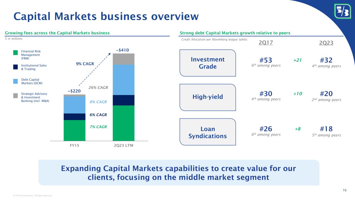 © Fifth Third Bancorp | All Rights Reserved Rize acquisition accelerates long standing embedded payments capabilities 15 Combining over a decade of embedded payments expertise with acquisition of Rize Money to form Newline TM by Fifth Third Client list includes a broad range of category leaders • Expect FY23 deposit growth of ~40% (expect 4Q23 balances of ~$2B) Acquirer BIN (bank identification number) sponsorship Issuing BIN sponsorship Credit Card BIN sponsorship Originating depository financial institution ACH / Wire processing Deposit Account Solutions Embedded payments at-a-glance 1 : • Modern, innovative, and highly-scalable embedded payments product platform • Large scale suite of payment types (debit, credit, ACH, RTP, wire, FedNow, etc.) • Allows clients to customize 20 APIs with functionality for 70+ product features • Differentiated capabilities with a focus on AML/BSA compliance; not just BaaS 2009 Post FTPS (Vantiv) spinoff Rize Money acquisition (2023) Launch of Newline TM (2023) to deliver innovative solutions and further accelerate growth of new quality relationships Payroll Consumer Payments Business Payments 1 Represents forward looking statement, please refer to page 2 of this presentation regarding forward-looking non-GAAP measures RTP 2019 Post MB Financial acquisition 2022 2019 2023E Total Fee Revenue Largest domestic payroll provider Issuing relationship with one of the top 3 core providers in the US Primary relationship with top 3 domestic provider and 2 of top 4 non-bank acquirers Merchant acquiring Relationship with leading SMB human capital management firm Relationship with leading small business payment provider