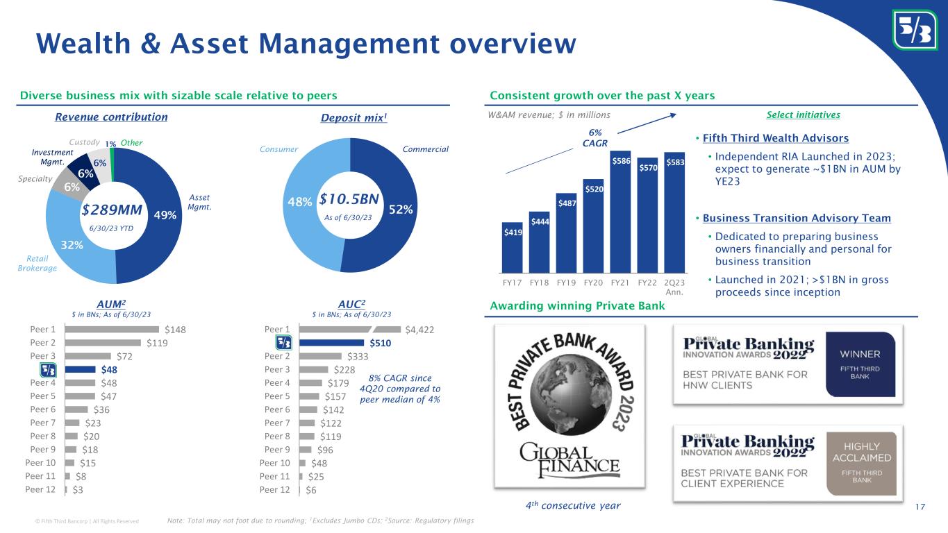 © Fifth Third Bancorp | All Rights Reserved FY15 2Q23 LTM ~$410 ~$220 Capital Markets business overview Growing fees across the Capital Markets business $ in millions Expanding Capital Markets capabilities to create value for our clients, focusing on the middle market segment 9% CAGR 26% CAGR 8% CAGR 6% CAGR 7% CAGR 16 Strong debt Capital Markets growth relative to peers Credit Allocation per Bloomberg league tables Financial Risk Management (FRM) Strategic Advisory & Investment Banking (incl. M&A) Institutional Sales & Trading Debt Capital Markets (DCM) Investment Grade High-yield Loan Syndications 2Q17 2Q23 #53 6 th among peers #30 4 th among peers #26 6 th among peers #32 4 th among peers #20 2 nd among peers #18 5 th among peers +21 +10 +8