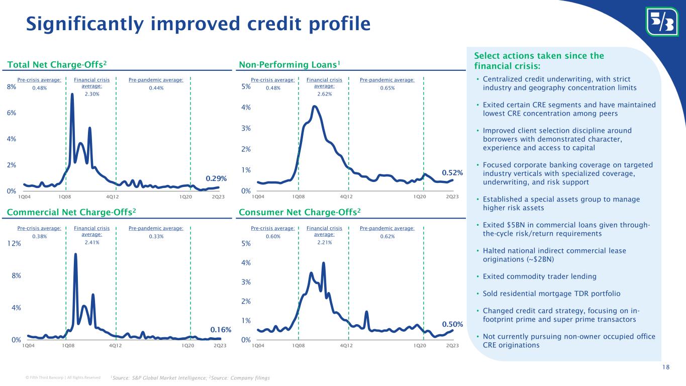 © Fifth Third Bancorp | All Rights Reserved 52% 48% $10.5BN As of 6/30/23 $419 $444 $487 $520 $586 $570 $583 FY17 FY18 FY19 FY20 FY21 FY22 2Q23 Ann. $3 $8 $15 $18 $20 $23 $36 $47 $48 $48 $72 $119 $148 Peer 12 Peer 11 Peer 10 Peer 9 Peer 8 Peer 7 Peer 6 Peer 5 Peer 4 X Peer 3 Peer 2 Peer 1 $6 $25 $48 $96 $119 $122 $142 $157 $179 $228 $333 $510 $4,422 Peer 12 Peer 11 Peer 10 Peer 9 Peer 8 Peer 7 Peer 6 Peer 5 Peer 4 Peer 3 Peer 2 X Peer 1 Wealth & Asset Management overview Diverse business mix with sizable scale relative to peers Revenue contribution 17 Note: Total may not foot due to rounding; 1 Excludes Jumbo CDs; 2 Source: Regulatory filings Deposit mix 1 Consistent growth over the past X years Awarding winning Private Bank Select initiatives AUM 2 $ in BNs; As of 6/30/23 AUC 2 $ in BNs; As of 6/30/23 8% CAGR since 4Q20 compared to peer median of 4% 4 th consecutive year • Fifth Third Wealth Advisors • Independent RIA Launched in 2023; expect to generate ~$1BN in AUM by YE23 • Business Transition Advisory Team • Dedicated to preparing business owners financially and personal for business transition • Launched in 2021; >$1BN in gross proceeds since inception 49% 32% 6% 6% 6% 1% $289MM 6/30/23 YTD Asset Mgmt. Retail Brokerage Specialty Investment Mgmt. Custody Other 6% CAGR W&AM revenue; $ in millions Consumer Commercial