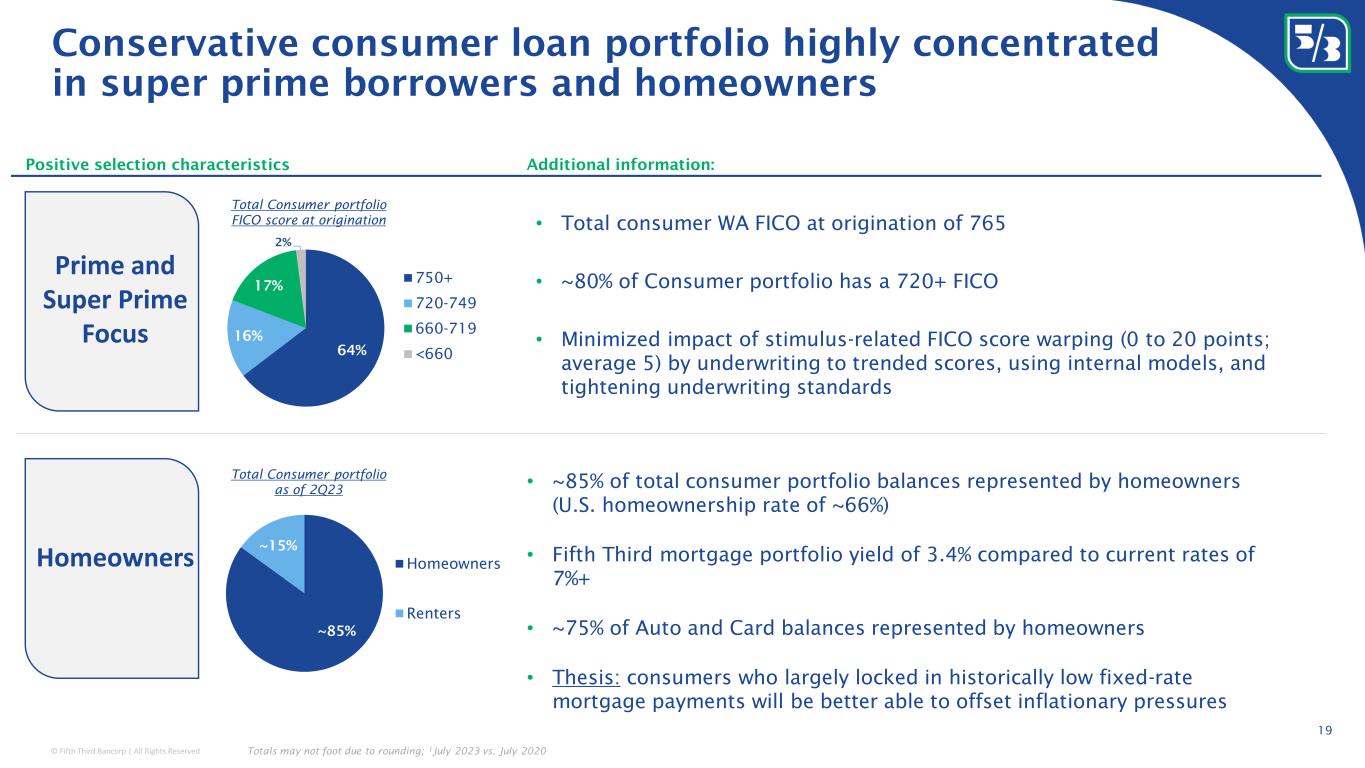 © Fifth Third Bancorp | All Rights Reserved 0.50% 0% 1% 2% 3% 4% 5% 1Q04 1Q08 4Q12 1Q20 2Q23 0.29% 0% 2% 4% 6% 8% 1Q04 1Q08 4Q12 1Q20 2Q23 0.52% 0% 1% 2% 3% 4% 5% 1Q04 1Q08 4Q12 1Q20 2Q23 0.16% 0% 4% 8% 12% 1Q04 1Q08 4Q12 1Q20 2Q23 Significantly improved credit profile Non-Performing Loans 1 Total Net Charge-Offs 2 Consumer Net Charge-Offs 2 Commercial Net Charge-Offs 2 • Centralized credit underwriting, with strict industry and geography concentration limits • Exited certain CRE segments and have maintained lowest CRE concentration among peers • Improved client selection discipline around borrowers with demonstrated character, experience and access to capital • Focused corporate banking coverage on targeted industry verticals with specialized coverage, underwriting, and risk support • Established a special assets group to manage higher risk assets • Exited $5BN in commercial loans given through- the-cycle risk/return requirements • Halted national indirect commercial lease originations (~$2BN) • Exited commodity trader lending • Sold residential mortgage TDR portfolio • Changed credit card strategy, focusing on in- footprint prime and super prime transactors • Not currently pursuing non-owner occupied office CRE originations 1 Source: S&P Global Market Intelligence; 2 Source: Company filings Select actions taken since the financial crisis: Pre-crisis average: 0.48% Financial crisis average: 2.30% Pre-pandemic average: 0.44% Pre-crisis average: 0.48% Financial crisis average: 2.62% Pre-pandemic average: 0.65% Pre-crisis average: 0.38% Financial crisis average: 2.41% Pre-pandemic average: 0.33% Pre-crisis average: 0.60% Financial crisis average: 2.21% Pre-pandemic average: 0.62% 18