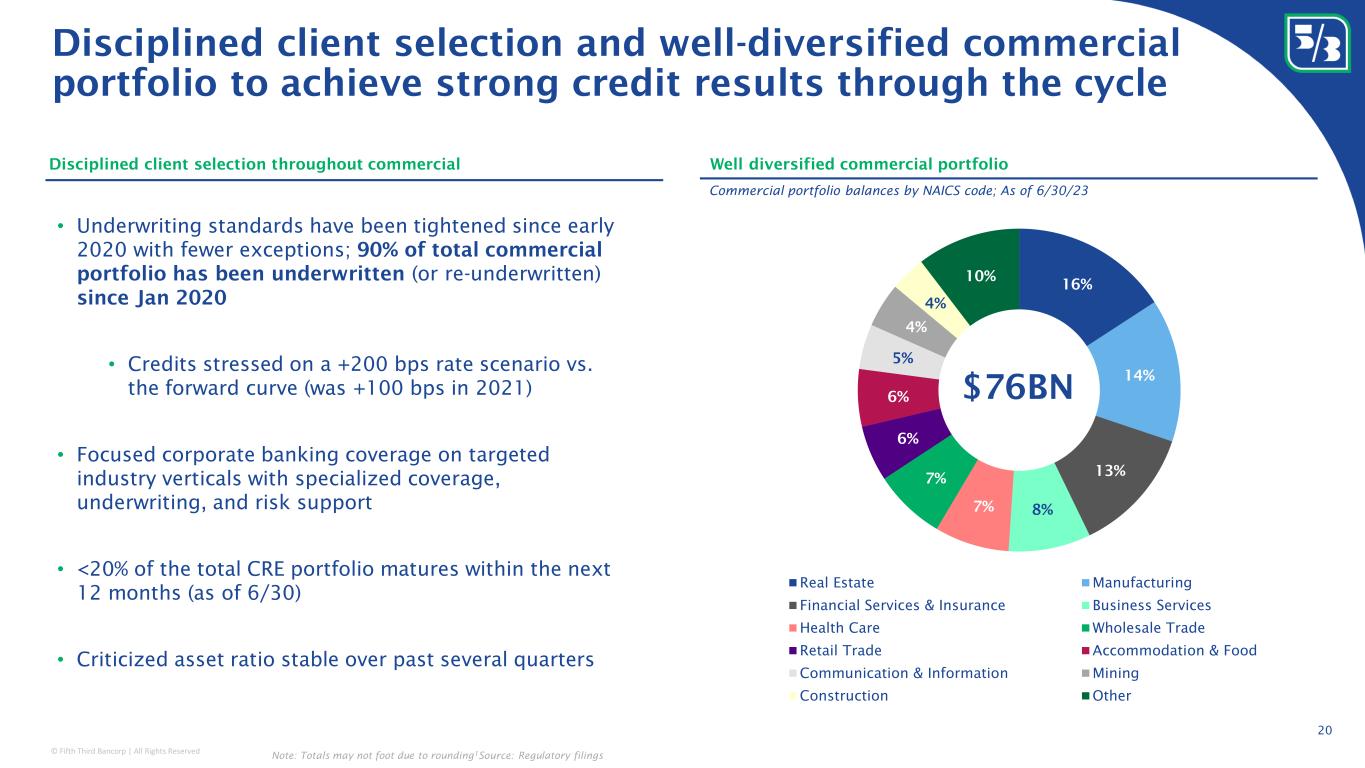 © Fifth Third Bancorp | All Rights Reserved 19 Conservative consumer loan portfolio highly concentrated in super prime borrowers and homeowners Totals may not foot due to rounding; 1 July 2023 vs. July 2020 Additional information: • ~85% of total consumer portfolio balances represented by homeowners (U.S. homeownership rate of ~66%) • Fifth Third mortgage portfolio yield of 3.4% compared to current rates of 7%+ • ~75% of Auto and Card balances represented by homeowners • Thesis: consumers who largely locked in historically low fixed-rate mortgage payments will be better able to offset inflationary pressures Homeowners Prime and Super Prime Focus • Total consumer WA FICO at origination of 765 • ~80% of Consumer portfolio has a 720+ FICO • Minimized impact of stimulus-related FICO score warping (0 to 20 points; average 5) by underwriting to trended scores, using internal models, and tightening underwriting standards 64% 16% 17% 2% 750+ 720-749 660-719 <660 Positive selection characteristics Total Consumer portfolio FICO score at origination ~85% ~15% Homeowners Renters Total Consumer portfolio as of 2Q23