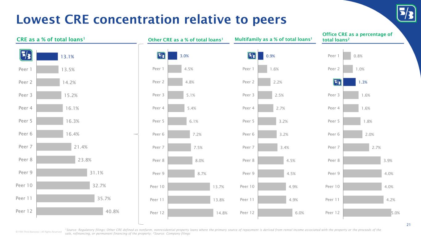© Fifth Third Bancorp | All Rights Reserved 14.8% 13.8% 13.7% 8.7% 8.0% 7.5% 7.2% 6.1% 5.4% 5.1% 4.8% 4.5% 3.0% Peer 12 Peer 11 Peer 10 Peer 9 Peer 8 Peer 7 Peer 6 Peer 5 Peer 4 Peer 3 Peer 2 Peer 1 x 6.0% 4.9% 4.9% 4.5% 4.5% 3.4% 3.2% 3.2% 2.7% 2.5% 2.2% 1.6% 0.9% Peer 12 Peer 11 Peer 10 Peer 9 Peer 8 Peer 7 Peer 6 Peer 5 Peer 4 Peer 3 Peer 2 Peer 1 x 5.0% 4.2% 4.0% 4.0% 3.9% 2.7% 2.0% 1.8% 1.6% 1.6% 1.3% 1.0% 0.8% Peer 12 Peer 11 Peer 10 Peer 9 Peer 8 Peer 7 Peer 6 Peer 5 Peer 4 Peer 3 x Peer 2 Peer 1 Lowest CRE concentration relative to peers 40.8% 35.7% 32.7% 31.1% 23.8% 21.4% 16.4% 16.3% 16.1% 15.2% 14.2% 13.5% 13.1% Peer 12 Peer 11 Peer 10 Peer 9 Peer 8 Peer 7 Peer 6 Peer 5 Peer 4 Peer 3 Peer 2 Peer 1 FITB CRE as a % of total loans 1 Multifamily as a % of total loans 1 Office CRE as a percentage of total loans 2 1 Source: Regulatory filings; Other CRE defined as nonfarm, nonresidential property loans where the primary source of repayment is derived from rental income associated with the property or the proceeds of the sale, refinancing, or permanent financing of the property; 2 Source: Company filings Other CRE as a % of total loans 1 21