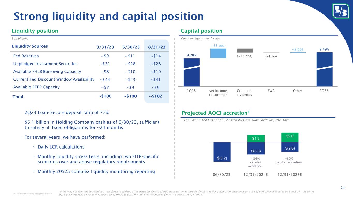 © Fifth Third Bancorp | All Rights Reserved 23 Office represents 1.3% of total loans Office CRE portfolio stats $ billions $ balance % of total loans Multifamily $3.1 2.5% Office 1.6 1.3 Hospitality 1.5 1.2 Retail 1.2 1.0 Industrial 1.1 0.9 Other 2.0 1.6 Total non-owner occupied CRE $10.5 8.5% As of 6/30/23; CRE is non-owner occupied Limited office CRE exposure with strong credit quality Office 1.3% Other CRE 7.2% Average loan commitment $9.7 million NCOs / average loans (LTM) (0.01)% Delinquencies / loans 0.01% NPL / loans 0.2% Criticized loans / loans 7.2% As of 2Q23; Non-owner occupied Total Bancorp loans $123BN • Office CRE of $1.6B represents 1.3% of total loans • LTV range of 55 – 60% at origination; focus on disciplined regional and national clients with longstanding relationships • Average commit of $9.7MM; conservative underwriting limiting amount of credit extended • Currently not pursuing new Office CRE originations Additional non-owner occupied office CRE metrics