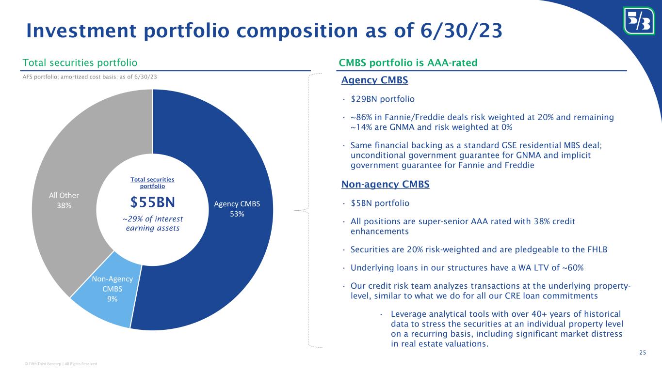 © Fifth Third Bancorp | All Rights Reserved Liquidity Sources 24 Strong liquidity and capital position • 2Q23 Loan-to-core deposit ratio of 77% • $5.1 billion in Holding Company cash as of 6/30/23, sufficient to satisfy all fixed obligations for ~24 months • For several years, we have performed: ◦ Daily LCR calculations ◦ Monthly liquidity stress tests, including two FITB-specific scenarios over and above regulatory requirements ◦ Monthly 2052a complex liquidity monitoring reporting Liquidity position $ in billions Fed Reserves Unpledged Investment Securities Available FHLB Borrowing Capacity Current Fed Discount Window Availability Total ~$11 ~$28 ~$10 ~$43 ~$100 3/31/23 Available BTFP Capacity ~$9 Capital position Common equity tier 1 ratio Projected AOCI accretion 1 $ in billions; AOCI as of 6/30/23 securities and swap portfolios, after-tax 2 ~$9 ~$31 ~$8 ~$44 ~$100 ~$7 6/30/23 Totals may not foot due to rounding; 1 See forward-looking statements on page 2 of this presentation regarding forward-looking non-GAAP measures and use of non-GAAP measures on pages 27 – 28 of the 2Q23 earnings release; 2 Analysis based on 6/30/2023 portfolio utilizing the implied forward curve as of 7/3/2023 ~36% capital accretion ~50% capital accretion ~$14 ~$28 ~$10 ~$41 ~$102 ~$9 8/31/23