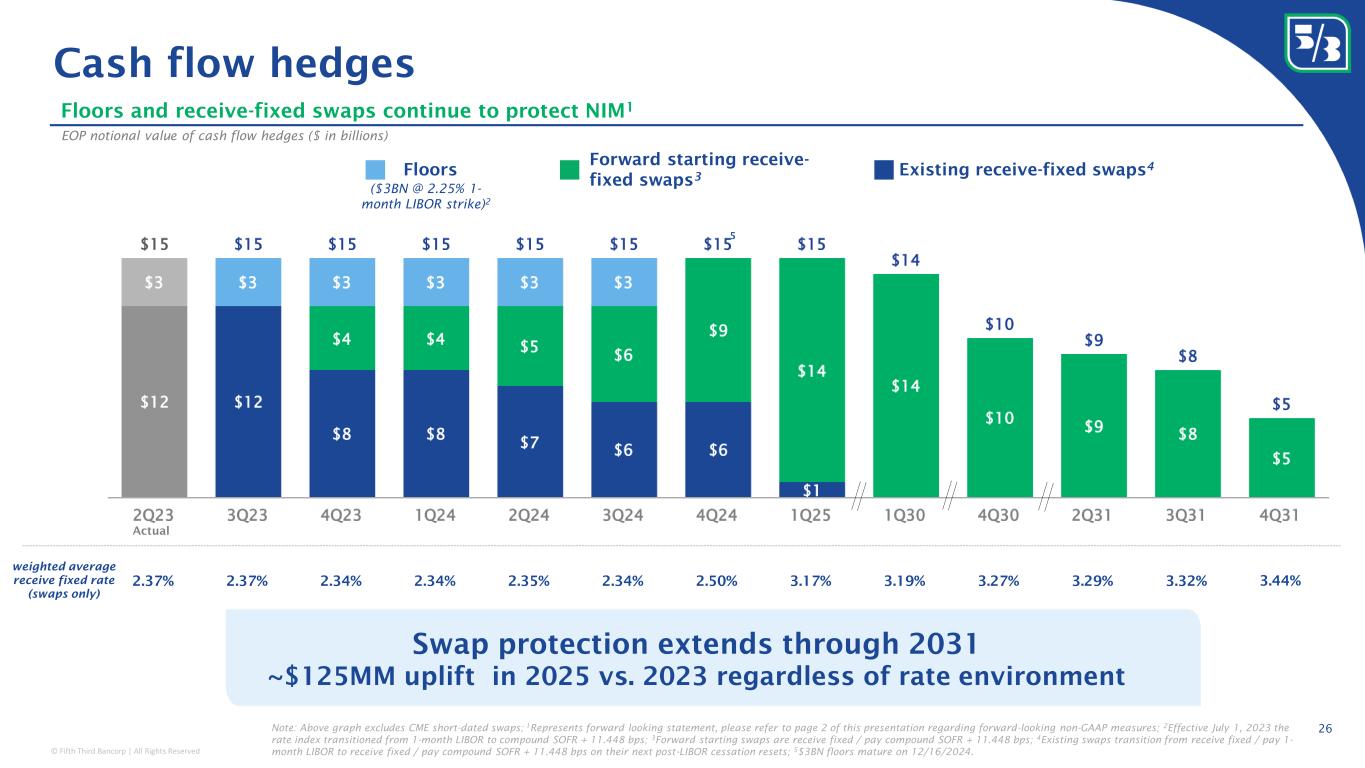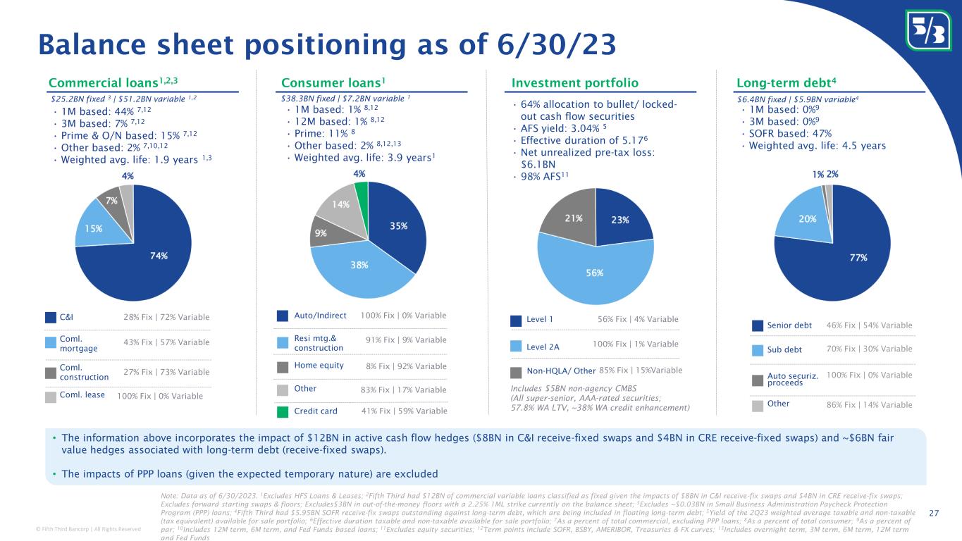 © Fifth Third Bancorp | All Rights Reserved Cash flow hedges ($3BN @ 2.25% 1- month LIBOR strike) 2 Floors and receive-fixed swaps continue to protect NIM 1 EOP notional value of cash flow hedges ($ in billions) Actual Note: Above graph excludes CME short-dated swaps; 1 Represents forward looking statement, please refer to page 2 of this presentation regarding forward-looking non-GAAP measures; 2 Effective July 1, 2023 the rate index transitioned from 1-month LIBOR to compound SOFR + 11.448 bps; 3 Forward starting swaps are receive fixed / pay compound SOFR + 11.448 bps; 4 Existing swaps transition from receive fixed / pay 1- month LIBOR to receive fixed / pay compound SOFR + 11.448 bps on their next post-LIBOR cessation resets; 5 $3BN floors mature on 12/16/2024. Swap protection extends through 2031 ~$125MM uplift in 2025 vs. 2023 regardless of rate environment 26 Floors Forward starting receive- fixed swaps 3 Existing receive-fixed swaps 4 weighted average receive fixed rate (swaps only) 2.37% 2.37% 3.32%2.34% 2.34%2.34% 2.35% 2.50% 3.17% 3.19% 3.27% 3.29% 3.44% 5