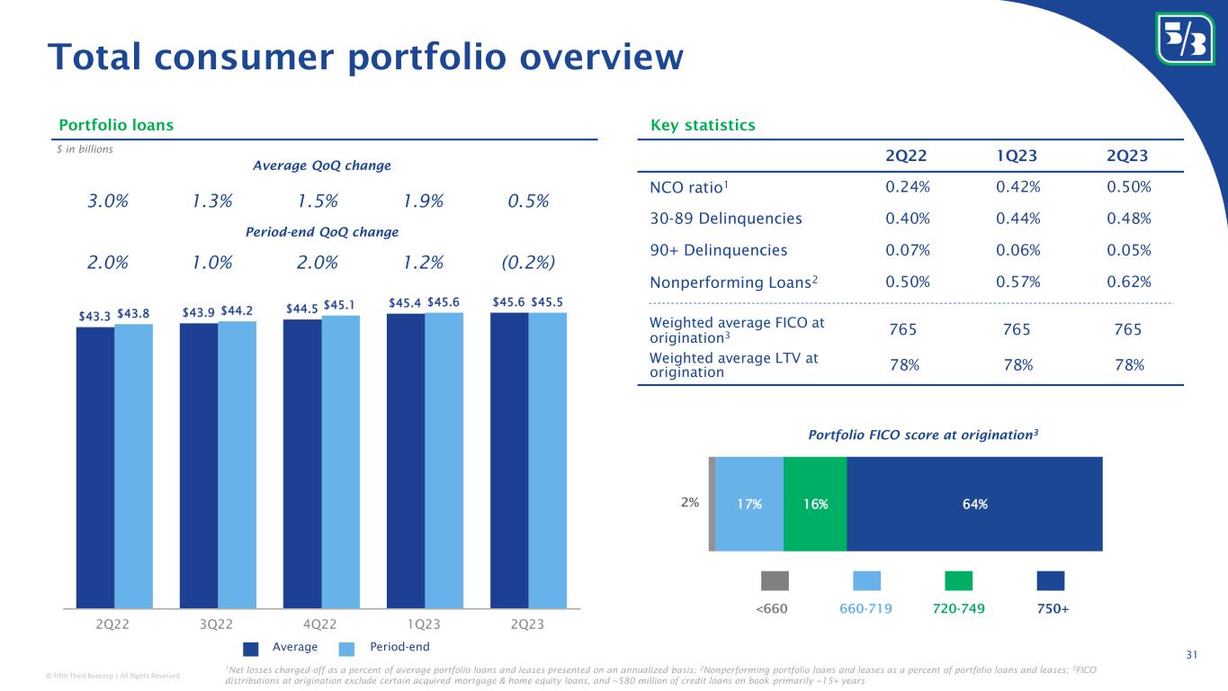 © Fifth Third Bancorp | All Rights Reserved Classification: Internal Use 2Q22 1Q23 2Q23 NCO ratio 1 0.07% 0.04% 0.00% 30-89 Delinquencies 0.07% 0.04% 0.17% 90+ Delinquencies 0.00% 0.00% 0.12% Nonperforming Loans 2 0.30% 0.29% 0.13% Commercial real estate overview CRE Mortgage Balance by occupancy CRE Construction Balance by property type Portfolio loans Key statistics Period-end QoQ change Average QoQ change $ in billions (0.1%) 2.6% (0.4%) 2.0% 0.1% 1.1% 1.5% 0.8% 1.1% 1.7% Multifamily Other Retail Hospitality Office Industrial Home Builder Non-Owner Occupied Owner Occupied Multifamily 20% Office 20% Hospitality 19% Retail 18% Industrial 6% Other 17% Non-owner occupied property type mix 30 1 Net losses charged-off as a percent of average portfolio loans and leases presented on an annualized basis; 2 Nonperforming portfolio loans and leases as a percent of portfolio loans and leases