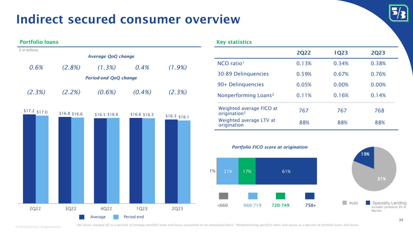 © Fifth Third Bancorp | All Rights Reserved Classification: Internal Use 2Q22 1Q23 2Q23 NCO ratio 1 (0.06%) (0.04%) 0.06% 30-89 Delinquencies 0.56% 0.58% 0.61% 90+ Delinquencies 0.05% 0.03% 0.03% Nonperforming Loans 2 1.84% 1.72% 1.56% Weighted average FICO at origination 3 765 767 767 Weighted average LTV at origination 68% 67% 67% Home equity overview 33 Portfolio FICO score at origination 3 $ in billions Portfolio balances Key statistics Period-end QoQ change Average QoQ change (2.8%) 1.6% 1.7% (0.5%) (1.7%) (0.3%) 2.4% 1.0% (2.0%) (1.2%) 750+720-749<660 660-719 2% Period-endAverage 1 Net losses charged-off as a percent of average portfolio loans and leases presented on an annualized basis; 2 Nonperforming portfolio loans and leases as a percent of portfolio loans and leases; 3 FICO distributions at origination exclude certain acquired home equity loans