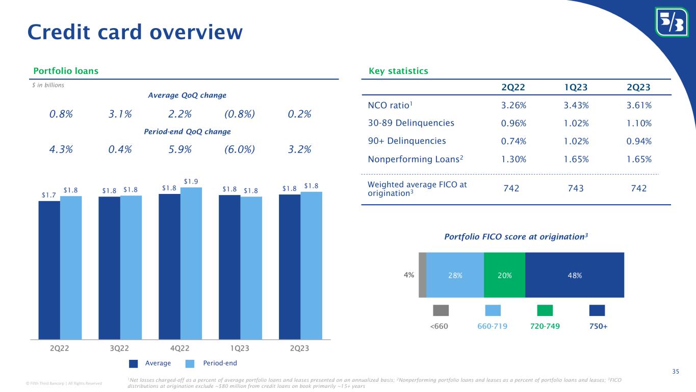 © Fifth Third Bancorp | All Rights Reserved Classification: Internal Use 2Q22 1Q23 2Q23 NCO ratio 1 0.13% 0.34% 0.38% 30-89 Delinquencies 0.59% 0.67% 0.76% 90+ Delinquencies 0.05% 0.00% 0.00% Nonperforming Loans 2 0.11% 0.16% 0.14% Indirect secured consumer overview 34 Portfolio FICO score at origination Includes primarily RV & Marine $ in billions Portfolio loans Key statistics Period-end QoQ change Average QoQ change 1% 0.6% (2.8%) (1.3%) 0.4% (1.9%) (2.3%) (2.2%) (0.6%) (0.4%) (2.3%) 750+720-749<660 660-719 Period-endAverage Weighted average FICO at origination 3 767 767 768 Weighted average LTV at origination 88% 88% 88% 1 Net losses charged-off as a percent of average portfolio loans and leases presented on an annualized basis; 2 Nonperforming portfolio loans and leases as a percent of portfolio loans and leases