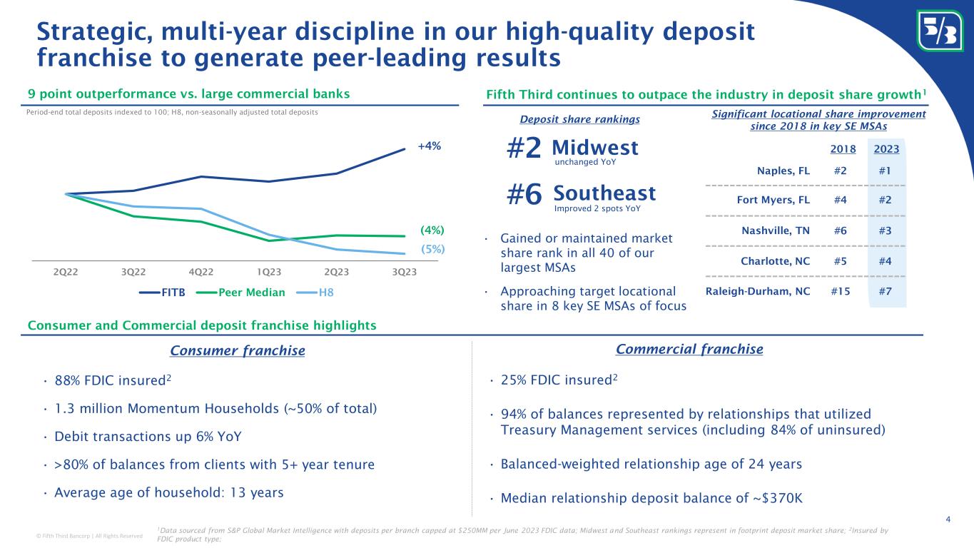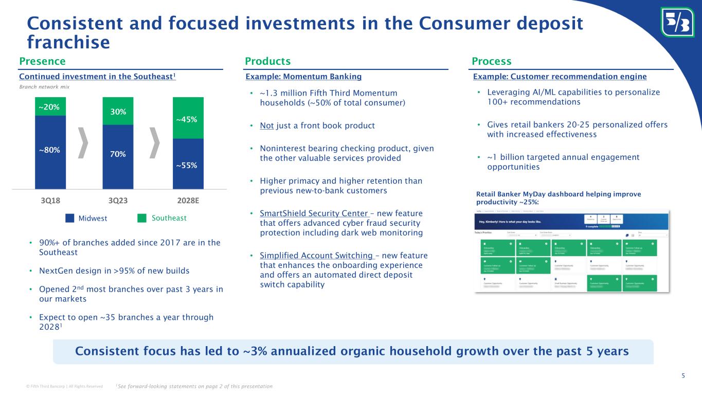 © Fifth Third Bancorp | All Rights Reserved 2Q22 3Q22 4Q22 1Q23 2Q23 3Q23 FITB Peer Median H8 • 25% FDIC insured 2 • 94% of balances represented by relationships that utilized Treasury Management services (including 84% of uninsured) • Balanced-weighted relationship age of 24 years • Median relationship deposit balance of ~$370K Strategic, multi-year discipline in our high-quality deposit franchise to generate peer-leading results 9 point outperformance vs. large commercial banks Period-end total deposits indexed to 100; H8, non-seasonally adjusted total deposits Consumer and Commercial deposit franchise highlights 1 Data sourced from S&P Global Market Intelligence with deposits per branch capped at $250MM per June 2023 FDIC data; Midwest and Southeast rankings represent in footprint deposit market share; 2 Insured by FDIC product type; 4 • 88% FDIC insured 2 • 1.3 million Momentum Households (~50% of total) • Debit transactions up 6% YoY • >80% of balances from clients with 5+ year tenure • Average age of household: 13 years Consumer franchise Commercial franchise Fifth Third continues to outpace the industry in deposit share growth 1 +4% (5%) (4%) #2 #6 Midwest Southeast unchanged YoY Improved 2 spots YoY • Gained or maintained market share rank in all 40 of our largest MSAs • Approaching target locational share in 8 key SE MSAs of focus Significant locational share improvement since 2018 in key SE MSAs Deposit share rankings Naples, FL 2018 2023 Nashville, TN Fort Myers, FL Charlotte, NC Raleigh-Durham, NC #2 #6 #4 #5 #15 #1 #3 #2 #4 #7