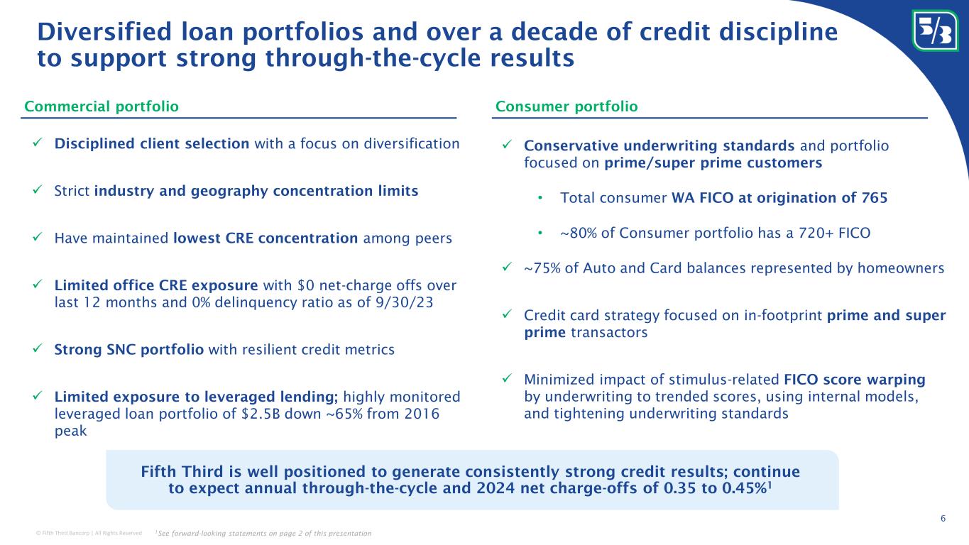 © Fifth Third Bancorp | All Rights Reserved 5 Presence 1 See forward-looking statements on page 2 of this presentation Consistent and focused investments in the Consumer deposit franchise Products Consistent focus has led to ~3% annualized organic household growth over the past 5 years • 90%+ of branches added since 2017 are in the Southeast • NextGen design in >95% of new builds • Opened 2 nd most branches over past 3 years in our markets • Expect to open ~35 branches a year through 2028 1 • ~1.3 million Fifth Third Momentum households (~50% of total consumer) • Not just a front book product • Noninterest bearing checking product, given the other valuable services provided • Higher primacy and higher retention than previous new-to-bank customers • SmartShield Security Center – new feature that offers advanced cyber fraud security protection including dark web monitoring • Simplified Account Switching – new feature that enhances the onboarding experience and offers an automated direct deposit switch capability • Leveraging AI/ML capabilities to personalize 100+ recommendations • Gives retail bankers 20-25 personalized offers with increased effectiveness • ~1 billion targeted annual engagement opportunities Retail Banker MyDay dashboard helping improve productivity ~25%: Example: Momentum Banking Example: Customer recommendation engine Process Continued investment in the Southeast 1 3Q18 3Q23 2028E ~20% ~80% 30% 70% ~45% ~55% Midwest Southeast Branch network mix