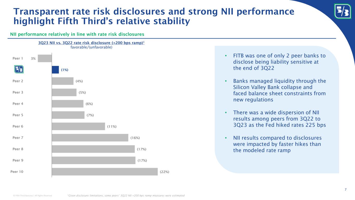 © Fifth Third Bancorp | All Rights Reserved ✓ Disciplined client selection with a focus on diversification ✓ Strict industry and geography concentration limits ✓ Have maintained lowest CRE concentration among peers ✓ Limited office CRE exposure with $0 net-charge offs over last 12 months and 0% delinquency ratio as of 9/30/23 ✓ Strong SNC portfolio with resilient credit metrics ✓ Limited exposure to leveraged lending; highly monitored leveraged loan portfolio of $2.5B down ~65% from 2016 peak Fifth Third is well positioned to generate consistently strong credit results; continue to expect annual through-the-cycle and 2024 net charge-offs of 0.35 to 0.45% 1 Diversified loan portfolios and over a decade of credit discipline to support strong through-the-cycle results 6 Commercial portfolio Consumer portfolio ✓ Conservative underwriting standards and portfolio focused on prime/super prime customers • Total consumer WA FICO at origination of 765 • ~80% of Consumer portfolio has a 720+ FICO ✓ ~75% of Auto and Card balances represented by homeowners ✓ Credit card strategy focused on in-footprint prime and super prime transactors ✓ Minimized impact of stimulus-related FICO score warping by underwriting to trended scores, using internal models, and tightening underwriting standards 1 See forward-looking statements on page 2 of this presentation