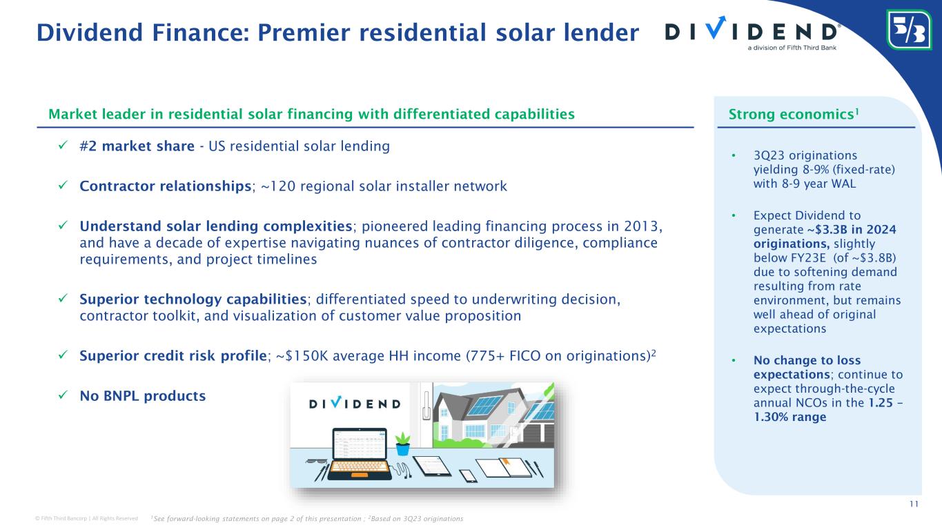 © Fifth Third Bancorp | All Rights Reserved Dividend Finance: Premier residential solar lender 11 ✓ #2 market share - US residential solar lending ✓ Contractor relationships; ~120 regional solar installer network ✓ Understand solar lending complexities; pioneered leading financing process in 2013, and have a decade of expertise navigating nuances of contractor diligence, compliance requirements, and project timelines ✓ Superior technology capabilities; differentiated speed to underwriting decision, contractor toolkit, and visualization of customer value proposition ✓ Superior credit risk profile; ~$150K average HH income (775+ FICO on originations) 2 ✓ No BNPL products • 3Q23 originations yielding 8-9% (fixed-rate) with 8-9 year WAL • Expect Dividend to generate ~$3.3B in 2024 originations, slightly below FY23E (of ~$3.8B) due to softening demand resulting from rate environment, but remains well ahead of original expectations • No change to loss expectations; continue to expect through-the-cycle annual NCOs in the 1.25 – 1.30% range Strong economics 1 Market leader in residential solar financing with differentiated capabilities 1 See forward-looking statements on page 2 of this presentation ; 2 Based on 3Q23 originations