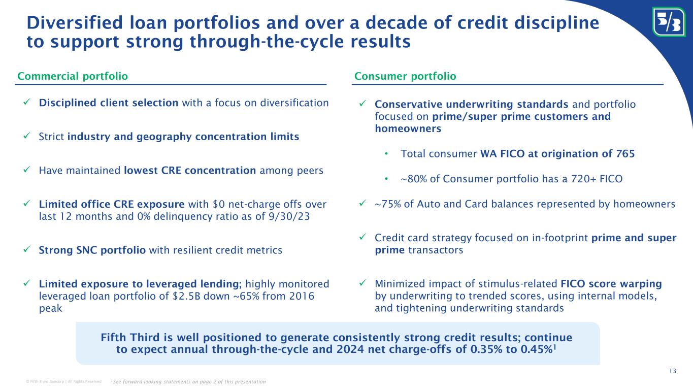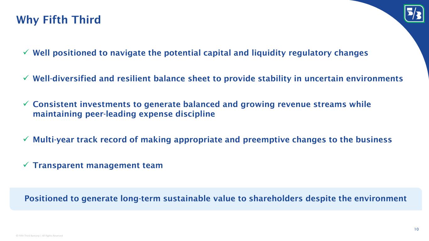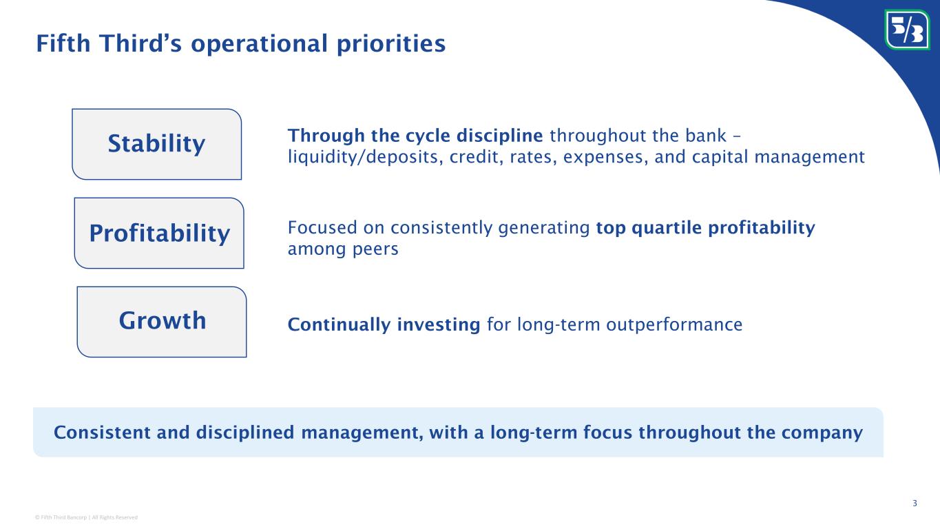 © Fifth Third Bancorp | All Rights Reserved This presentation contains statements that we believe are “forward-looking statements” within the meaning of Section 27A of the Securities Act of 1933, as amended, and Rule 175 promulgated thereunder, and Section 21E of the Securities Exchange Act of 1934, as amended, and Rule 3b-6 promulgated thereunder. All statements other than statements of historical fact are forward-looking statements. These statements relate to our financial condition, results of operations, plans, objectives, future performance, capital actions or business. They usually can be identified by the use of forward-looking language such as “will likely result,” “may,” “are expected to,” “is anticipated,” “potential,” “estimate,” “forecast,” “projected,” “intends to,” or may include other similar words or phrases such as “believes,” “plans,” “trend,” “objective,” “continue,” “remain,” or similar expressions, or future or conditional verbs such as “will,” “would,” “should,” “could,” “might,” “can,” or similar verbs. You should not place undue reliance on these statements, as they are subject to risks and uncertainties, including but not limited to the risk factors set forth in our most recent Annual Report on Form 10-K as updated by our filings with the U.S. Securities and Exchange Commission (“SEC”). There are a number of important factors that could cause future results to differ materially from historical performance and these forward-looking statements. Factors that might cause such a difference include, but are not limited to: (1) effects of the global COVID-19 pandemic; (2) deteriorating credit quality; (3) loan concentration by location or industry of borrowers or collateral; (4) problems encountered by other financial institutions; (5) inadequate sources of funding or liquidity; (6) unfavorable actions of rating agencies; (7) inability to maintain or grow deposits; (8) limitations on the ability to receive dividends from subsidiaries; (9) cyber-security risks; (10) Fifth Third’s ability to secure confidential information and deliver products and services through the use of computer systems and telecommunications networks; (11) failures by third-party service providers; (12) inability to manage strategic initiatives and/or organizational changes; (13) inability to implement technology system enhancements; (14) failure of internal controls and other risk management systems; (15) losses related to fraud, theft, misappropriation or violence; (16) inability to attract and retain skilled personnel; (17) adverse impacts of government regulation; (18) governmental or regulatory changes or other actions; (19) failures to meet applicable capital requirements; (20) regulatory objections to Fifth Third’s capital plan; (21) regulation of Fifth Third’s derivatives activities; (22) deposit insurance premiums; (23) assessments for the orderly liquidation fund; (24) replacement of LIBOR; (25) weakness in the national or local economies; (26) global political and economic uncertainty or negative actions; (27) changes in interest rates and the effects of inflation; (28) changes and trends in capital markets; (29) fluctuation of Fifth Third’s stock price; (30) volatility in mortgage banking revenue; (31) litigation, investigations, and enforcement proceedings by governmental authorities; (32) breaches of contractual covenants, representations and warranties; (33) competition and changes in the financial services industry; (34) changing retail distribution strategies, customer preferences and behavior; (35) difficulties in identifying, acquiring or integrating suitable strategic partnerships, investments or acquisitions; (36) potential dilution from future acquisitions; (37) loss of income and/or difficulties encountered in the sale and separation of businesses, investments or other assets; (38) results of investments or acquired entities; (39) changes in accounting standards or interpretation or declines in the value of Fifth Third’s goodwill or other intangible assets; (40) inaccuracies or other failures from the use of models; (41) effects of critical accounting policies and judgments or the use of inaccurate estimates; (42) weather-related events, other natural disasters, or health emergencies (including pandemics); (43) the impact of reputational risk created by these or other developments on such matters as business generation and retention, funding and liquidity; (44) changes in law or requirements imposed by Fifth Third’s regulators impacting our capital actions, including dividend payments and stock repurchases; and (45) Fifth Third's ability to meet its environmental and/or social targets, goals and commitments. You should refer to our periodic and current reports filed with the Securities and Exchange Commission, or “SEC,” for further information on other factors, which could cause actual results to be significantly different from those expressed or implied by these forward-looking statements. Moreover, you should treat these statements as speaking only as of the date they are made and based only on information then actually known to us. We expressly disclaim any obligation or undertaking to release publicly any updates or revisions to any forward-looking statements contained herein to reflect any change in our expectations or any changes in events, conditions or circumstances on which any such statement is based, except as may be required by law, and we claim the protection of the safe harbor for forward-looking statements contained in the Private Securities Litigation Reform Act of 1995. The information contained herein is intended to be reviewed in its totality, and any stipulations, conditions or provisos that apply to a given piece of information in one part of this press release should be read as applying mutatis mutandis to every other instance of such information a