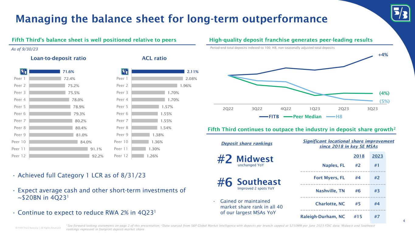 © Fifth Third Bancorp | All Rights Reserved Fifth Third’s operational priorities Continually investing for long-term outperformance Through the cycle discipline throughout the bank – liquidity/deposits, credit, rates, expenses, and capital management Focused on consistently generating top quartile profitability among peers Stability Profitability Growth Consistent and disciplined management, with a long-term focus throughout the company 3