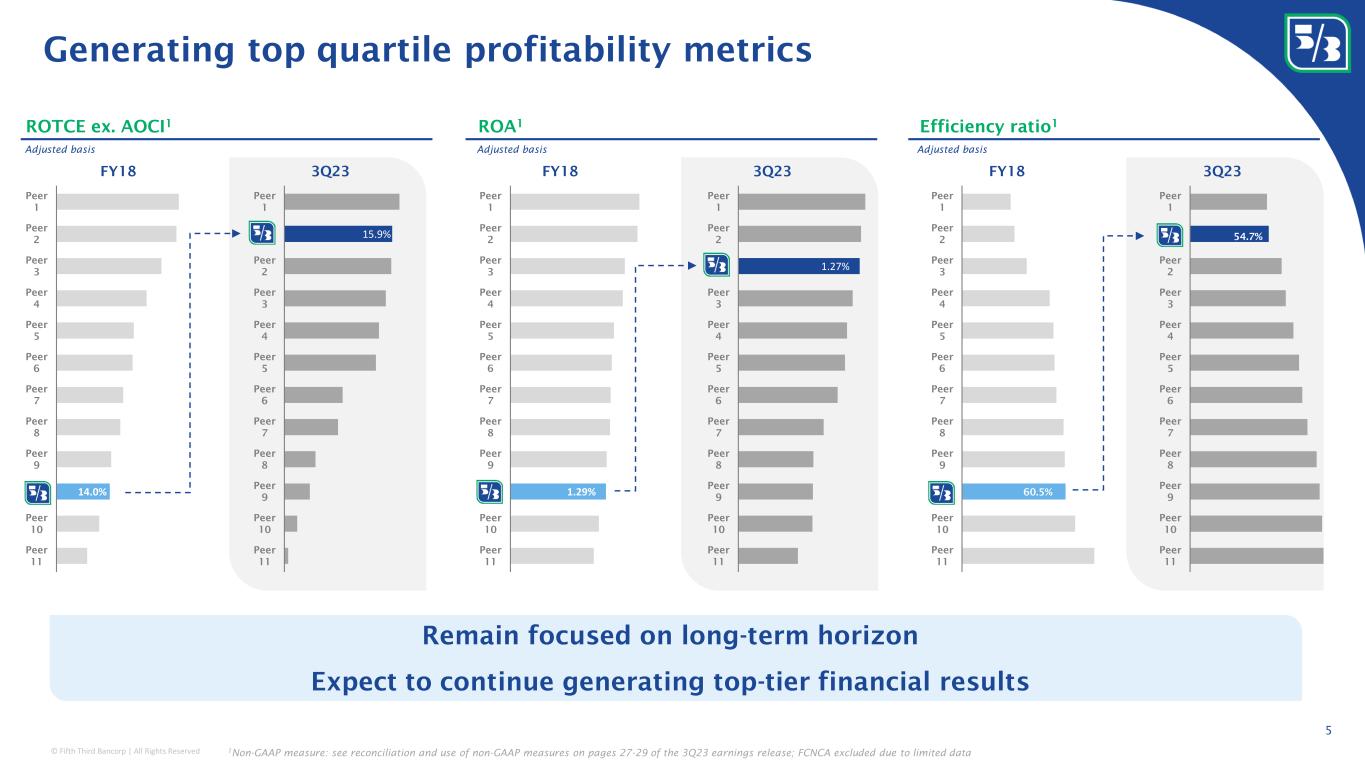 © Fifth Third Bancorp | All Rights Reserved 2Q22 3Q22 4Q22 1Q23 2Q23 3Q23 FITB Peer Median H8 Managing the balance sheet for long-term outperformance 4 Fifth Third’s balance sheet is well positioned relative to peers Loan-to-deposit ratio ACL ratio As of 9/30/23 High-quality deposit franchise generates peer-leading results Period-end total deposits indexed to 100; H8, non-seasonally adjusted total deposits +4% (5%) (4%) #2 #6 Midwest Southeast unchanged YoY Improved 2 spots YoY • Gained or maintained market share rank in all 40 of our largest MSAs YoY Significant locational share improvement since 2018 in key SE MSAs Deposit share rankings Naples, FL 2018 2023 Nashville, TN Fort Myers, FL Charlotte, NC Raleigh-Durham, NC #2 #6 #4 #5 #15 #1 #3 #2 #4 #7 Fifth Third continues to outpace the industry in deposit share growth 2 1.26% 1.30% 1.36% 1.38% 1.54% 1.55% 1.55% 1.57% 1.70% 1.70% 1.96% 2.08% 2.11% Peer 12 Peer 11 Peer 10 Peer 9 Peer 8 Peer 7 Peer 6 Peer 5 Peer 4 Peer 3 Peer 2 Peer 1 X 92.2% 91.1% 84.0% 81.0% 80.4% 80.2% 79.3% 78.9% 78.0% 75.5% 75.2% 72.4% 71.6% Peer 12 Peer 11 Peer 10 Peer 9 Peer 8 Peer 7 Peer 6 Peer 5 Peer 4 Peer 3 Peer 2 Peer 1 X • Achieved full Category 1 LCR as of 8/31/23 • Expect average cash and other short-term investments of ~$20BN in 4Q23 1 • Continue to expect to reduce RWA 2% in 4Q23 1 1 See forward-looking statements on page 2 of this presentation; 2 Data sourced from S&P Global Market Intelligence with deposits per branch capped at $250MM per June 2023 FDIC data; Midwest and Southeast rankings represent in footprint deposit market share