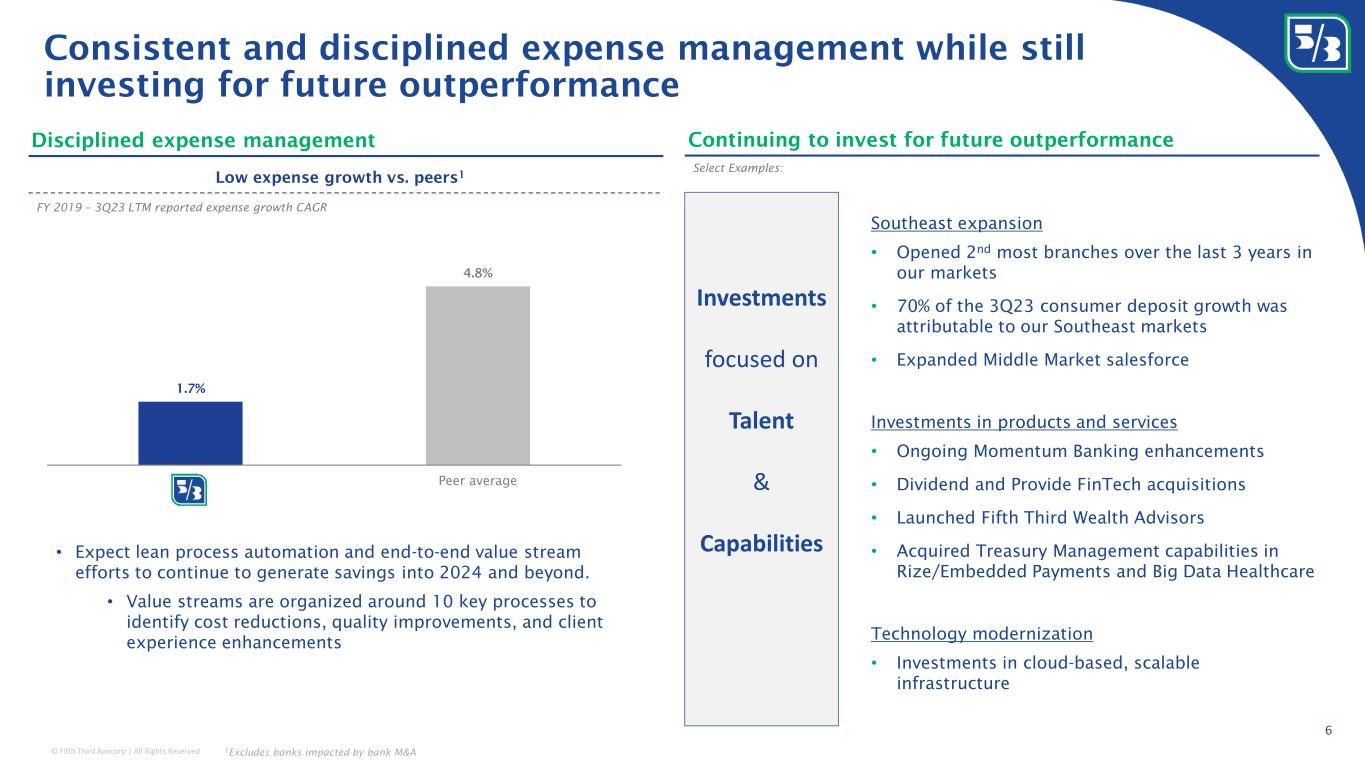© Fifth Third Bancorp | All Rights Reserved 60.5% Peer 11 Peer 10 x Peer 9 Peer 8 Peer 7 Peer 6 Peer 5 Peer 4 Peer 3 Peer 2 Peer 1 15.9% Peer 1 x Peer 2 Peer 3 Peer 4 Peer 5 Peer 6 Peer 7 Peer 8 Peer 9 Peer 10 Peer 11 14.0% Peer 1 Peer 2 Peer 3 Peer 4 Peer 5 Peer 6 Peer 7 Peer 8 Peer 9 x Peer 10 Peer 11 1.29% Peer 1 Peer 2 Peer 3 Peer 4 Peer 5 Peer 6 Peer 7 Peer 8 Peer 9 x Peer 10 Peer 11 1.27% Peer 1 Peer 2 x Peer 3 Peer 4 Peer 5 Peer 6 Peer 7 Peer 8 Peer 9 Peer 10 Peer 11 54.7% Peer 11 Peer 10 Peer 9 Peer 8 Peer 7 Peer 6 Peer 5 Peer 4 Peer 3 Peer 2 x Peer 1 Generating top quartile profitability metrics 5 ROTCE ex. AOCI 1 1 Non-GAAP measure: see reconciliation and use of non-GAAP measures on pages 27-29 of the 3Q23 earnings release; FCNCA excluded due to limited data FY18 3Q23 FY18 3Q23 FY18 3Q23 ROA 1 Efficiency ratio 1 Adjusted basis Adjusted basis Adjusted basis Remain focused on long-term horizon Expect to continue generating top-tier financial results