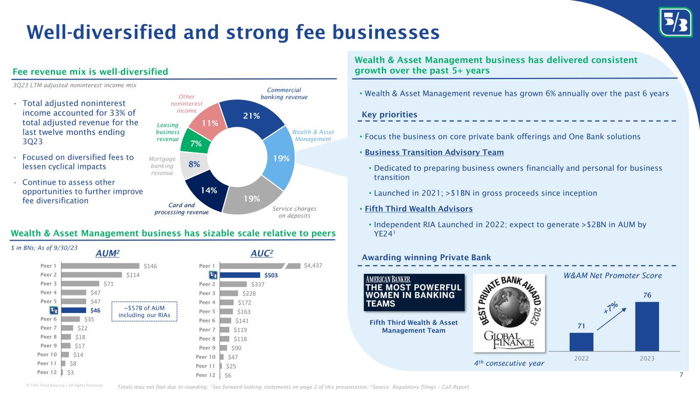 © Fifth Third Bancorp | All Rights Reserved 1.7% 4.8% x Peer average 6 Disciplined expense management 1 Excludes banks impacted by bank M&A Consistent and disciplined expense management while still investing for future outperformance Continuing to invest for future outperformance FY 2019 – 3Q23 LTM reported expense growth CAGR Low expense growth vs. peers 1 Investments focused on Talent & Capabilities Select Examples: • Expect lean process automation and end-to-end value stream efforts to continue to generate savings into 2024 and beyond. • Value streams are organized around 10 key processes to identify cost reductions, quality improvements, and client experience enhancements Southeast expansion • Opened 2 nd most branches over the last 3 years in our markets • 70% of the 3Q23 consumer deposit growth was attributable to our Southeast markets • Expanded Middle Market salesforce Investments in products and services • Ongoing Momentum Banking enhancements • Dividend and Provide FinTech acquisitions • Launched Fifth Third Wealth Advisors • Acquired Treasury Management capabilities in Rize/Embedded Payments and Big Data Healthcare Technology modernization • Investments in cloud-based, scalable infrastructure