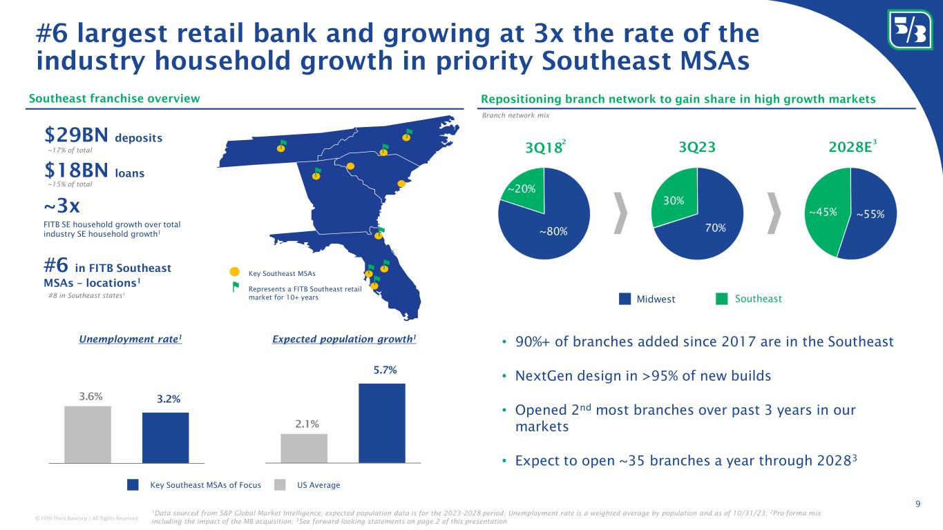 © Fifth Third Bancorp | All Rights Reserved 3.6% 3.2% USA SE of F 2.1% 5.7% USA SE of F #6 largest retail bank and growing at 3x the rate of the industry household growth in priority Southeast MSAs 9 Key Southeast MSAs Represents a FITB Southeast retail market for 10+ years Southeast franchise overview Repositioning branch network to gain share in high growth markets $29BN deposits $18BN loans ~3x FITB SE household growth over total industry SE household growth 1 #6 in FITB Southeast MSAs – locations 1 #8 in Southeast states 1 1 Data sourced from S&P Global Market Intelligence; expected population data is for the 2023-2028 period; Unemployment rate is a weighted average by population and as of 10/31/23; 2 Pro-forma mix including the impact of the MB acquisition; 3 See forward-looking statements on page 2 of this presentation ~17% of total ~15% of total • 90%+ of branches added since 2017 are in the Southeast • NextGen design in >95% of new builds • Opened 2 nd most branches over past 3 years in our markets • Expect to open ~35 branches a year through 2028 3 Midwest Southeast Branch network mix Expected population growth 1 Unemployment rate 1 US AverageKey Southeast MSAs of Focus ~45% ~55% ~20% ~80% 2028E3Q233Q18 2 3