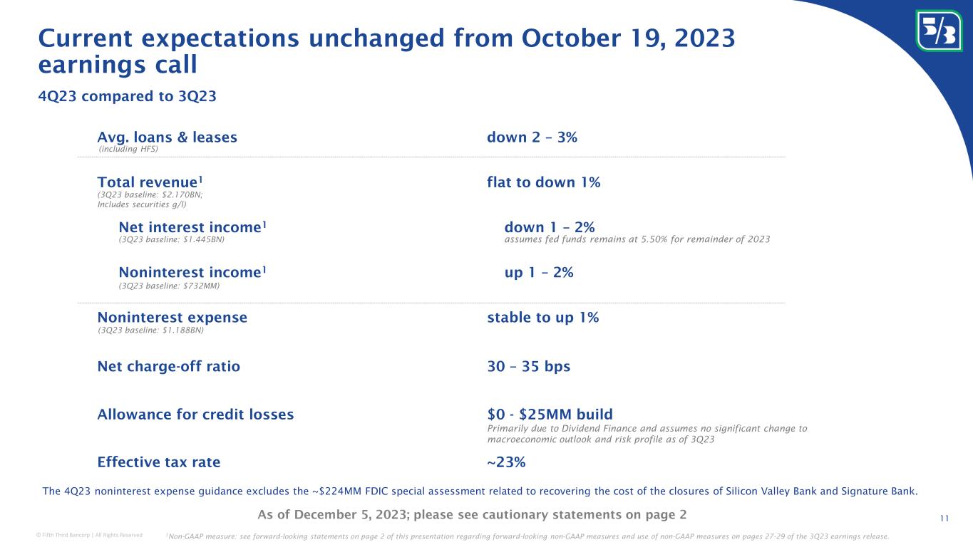 © Fifth Third Bancorp | All Rights Reserved Net interest income 1 Noninterest income 1 up 1 – 2% Noninterest expense stable to up 1% down 1 – 2% (3Q23 baseline: $1.445BN) (3Q23 baseline: $732MM) (3Q23 baseline: $1.188BN) Net charge-off ratio 30 – 35 bps Effective tax rate ~23% 1 Non-GAAP measure: see forward-looking statements on page 2 of this presentation regarding forward-looking non-GAAP measures and use of non-GAAP measures on pages 27-29 of the 3Q23 earnings release. As of December 5, 2023; please see cautionary statements on page 2 Total revenue 1 flat to down 1% (3Q23 baseline: $2.170BN; Includes securities g/l) (including HFS) Avg. loans & leases down 2 – 3% Current expectations unchanged from October 19, 2023 earnings call 11 assumes fed funds remains at 5.50% for remainder of 2023 Allowance for credit losses $0 - $25MM build The 4Q23 noninterest expense guidance excludes the ~$224MM FDIC special assessment related to recovering the cost of the closures of Silicon Valley Bank and Signature Bank. Primarily due to Dividend Finance and assumes no significant change to macroeconomic outlook and risk profile as of 3Q23 4Q23 compared to 3Q23