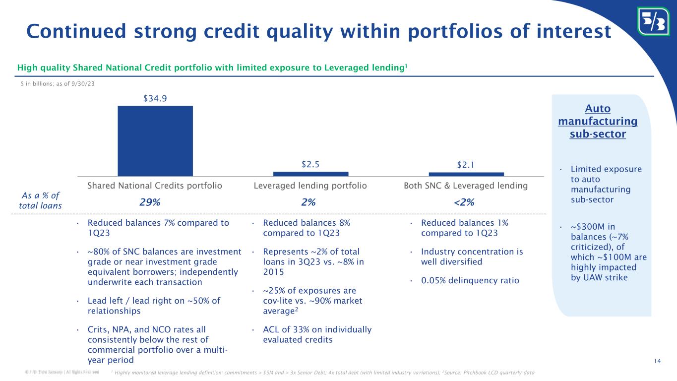 © Fifth Third Bancorp | All Rights Reserved ✓ Disciplined client selection with a focus on diversification ✓ Strict industry and geography concentration limits ✓ Have maintained lowest CRE concentration among peers ✓ Limited office CRE exposure with $0 net-charge offs over last 12 months and 0% delinquency ratio as of 9/30/23 ✓ Strong SNC portfolio with resilient credit metrics ✓ Limited exposure to leveraged lending; highly monitored leveraged loan portfolio of $2.5B down ~65% from 2016 peak Fifth Third is well positioned to generate consistently strong credit results; continue to expect annual through-the-cycle and 2024 net charge-offs of 0.35% to 0.45% 1 Diversified loan portfolios and over a decade of credit discipline to support strong through-the-cycle results 13 Commercial portfolio Consumer portfolio ✓ Conservative underwriting standards and portfolio focused on prime/super prime customers and homeowners • Total consumer WA FICO at origination of 765 • ~80% of Consumer portfolio has a 720+ FICO ✓ ~75% of Auto and Card balances represented by homeowners ✓ Credit card strategy focused on in-footprint prime and super prime transactors ✓ Minimized impact of stimulus-related FICO score warping by underwriting to trended scores, using internal models, and tightening underwriting standards 1 See forward-looking statements on page 2 of this presentation