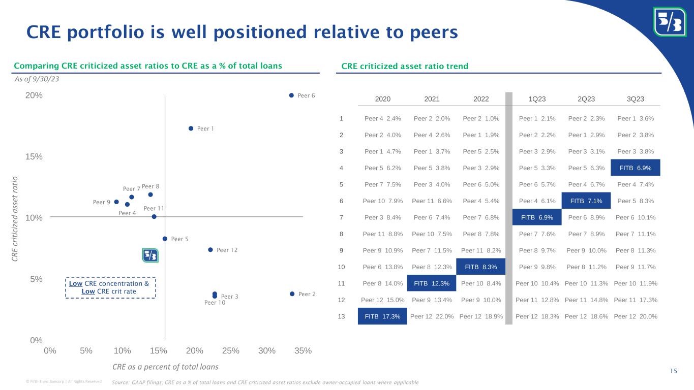 © Fifth Third Bancorp | All Rights Reserved Fifth Third Bancorp | All Rights Reserved • Limited exposure to auto manufacturing sub-sector • ~$300M in balances (~7% criticized), of which ~$100M are highly impacted by UAW strike 14 Continued strong credit quality within portfolios of interest 1 Highly monitored leverage lending definition: commitments > $5M and > 3x Senior Debt; 4x total debt (with limited industry variations); 2 Source: Pitchbook LCD quarterly data • Reduced balances 7% compared to 1Q23 • ~80% of SNC balances are investment grade or near investment grade equivalent borrowers; independently underwrite each transaction • Lead left / lead right on ~50% of relationships • Crits, NPA, and NCO rates all consistently below the rest of commercial portfolio over a multi- year period • Reduced balances 8% compared to 1Q23 • Represents ~2% of total loans in 3Q23 vs. ~8% in 2015 • ~25% of exposures are cov-lite vs. ~90% market average 2 • ACL of 33% on individually evaluated credits High quality Shared National Credit portfolio with limited exposure to Leveraged lending 1 Auto manufacturing sub-sector $ in billions; as of 9/30/23 As a % of total loans 29% 2% <2% • Reduced balances 1% compared to 1Q23 • Industry concentration is well diversified • 0.05% delinquency ratio