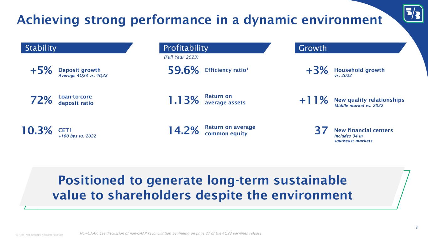 © Fifth Third Bancorp | All Rights Reserved Cautionary statement This presentation contains statements that we believe are “forward-looking statements” within the meaning of Section 27A of the Securities Act of 1933, as amended, and Rule 175 promulgated thereunder, and Section 21E of the Securities Exchange Act of 1934, as amended, and Rule 3b-6 promulgated thereunder. All statements other than statements of historical fact are forward-looking statements. These statements relate to our financial condition, results of operations, plans, objectives, future performance, capital actions or business. They usually can be identified by the use of forward-looking language such as “will likely result,” “may,” “are expected to,” “is anticipated,” “potential,” “estimate,” “forecast,” “projected,” “intends to,” or may include other similar words or phrases such as “believes,” “plans,” “trend,” “objective,” “continue,” “remain,” or similar expressions, or future or conditional verbs such as “will,” “would,” “should,” “could,” “might,” “can,” or similar verbs. You should not place undue reliance on these statements, as they are subject to risks and uncertainties, including but not limited to the risk factors set forth in our most recent Annual Report on Form 10-K as updated by our filings with the U.S. Securities and Exchange Commission (“SEC”). There are a number of important factors that could cause future results to differ materially from historical performance and these forward-looking statements. Factors that might cause such a difference include, but are not limited to: (1) deteriorating credit quality; (2) loan concentration by location or industry of borrowers or collateral; (3) problems encountered by other financial institutions; (4) inadequate sources of funding or liquidity; (5) unfavorable actions of rating agencies; (6) inability to maintain or grow deposits; (7) limitations on the ability to receive dividends from subsidiaries; (8) cyber-security risks; (9) Fifth Third’s ability to secure confidential information and deliver products and services through the use of computer systems and telecommunications networks; (10) failures by third-party service providers; (11) inability to manage strategic initiatives and/or organizational changes; (12) inability to implement technology system enhancements; (13) failure of internal controls and other risk management programs; (14) losses related to fraud, theft, misappropriation or violence; (15) inability to attract and retain skilled personnel; (16) adverse impacts of government regulation; (17) governmental or regulatory changes or other actions; (18) failures to meet applicable capital requirements; (19) regulatory objections to Fifth Third’s capital plan; (20) regulation of Fifth Third’s derivatives activities; (21) deposit insurance premiums; (22) assessments for the orderly liquidation fund; (23) weakness in the national or local economies; (24) global political and economic uncertainty or negative actions; (25) changes in interest rates and the effects of inflation; (26) changes and trends in capital markets; (27) fluctuation of Fifth Third’s stock price; (28) volatility in mortgage banking revenue; (29) litigation, investigations, and enforcement proceedings by governmental authorities; (30) breaches of contractual covenants, representations and warranties; (31) competition and changes in the financial services industry; (32) potential impacts of the adoption of real-time payment networks; (33) changing retail distribution strategies, customer preferences and behavior; (34) difficulties in identifying, acquiring or integrating suitable strategic partnerships, investments or acquisitions; (35) potential dilution from future acquisitions; (36) loss of income and/or difficulties encountered in the sale and separation of businesses, investments or other assets; (37) results of investments or acquired entities; (38) changes in accounting standards or interpretation or declines in the value of Fifth Third’s goodwill or other intangible assets; (39) inaccuracies or other failures from the use of models; (40) effects of critical accounting policies and judgments or the use of inaccurate estimates; (41) weather-related events, other natural disasters, or health emergencies (including pandemics); (42) the impact of reputational risk created by these or other developments on such matters as business generation and retention, funding and liquidity; (43) changes in law or requirements imposed by Fifth Third’s regulators impacting our capital actions, including dividend payments and stock repurchases; and (44) Fifth Third’s ability to meet its environmental and/or social targets, goals and commitments. You should refer to our periodic and current reports filed with the Securities and Exchange Commission, or “SEC,” for further information on other factors, which could cause actual results to be significantly different from those expressed or implied by these forward-looking statements. Moreover, you should treat these statements as speaking only as of the date they are made and based only on information then actually known to us. We expressly disclaim any obligation or undertaking to release publicly any updates or revisions to any forward-looking statements contained herein to reflect any change in our expectations or any changes in events, conditions or circumstances on which any such statement is based, except as may be required by law, and we claim the protection of the safe harbor for forward-looking statements contained in the Private Securities Litigation Reform Act of 1995. The information contained herein is intended to be reviewed in its totality, and any stipulations, conditions or provisos that apply to a given piece of information in one part of this press release should be read as applying mutatis mutandis to every other instance 