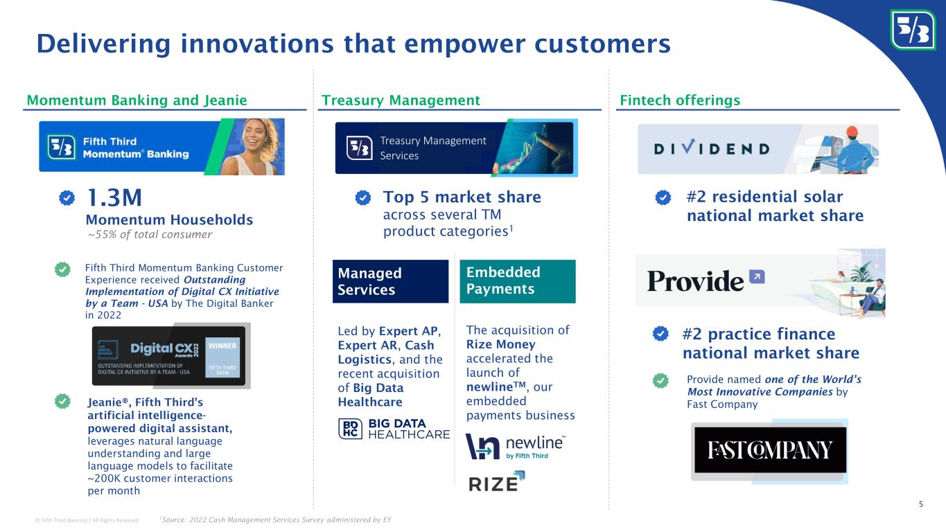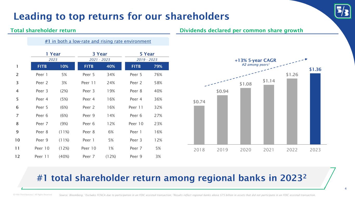 © Fifth Third Bancorp | All Rights Reserved $0.74 $0.94 $1.08 $1.14 $1.26 $1.36 2018 2019 2020 2021 2022 2023 Leading to top returns for our shareholders Total shareholder return Source: Bloomberg; 1 Excludes FCNCA due to participation in an FDIC assisted transaction; 2 Results reflect regional banks above $75 billion in assets that did not participate in an FDIC assisted transaction. #1 in both a low-rate and rising rate environment 0 #1 total shareholder return among regional banks in 2023 2 Dividends declared per common share growth 1 Year 3 Year 5 Year 2023 2021 - 2023 2019 - 2023 1 FITB 10% FITB 40% FITB 79% 2 Peer 1 5% Peer 5 34% Peer 5 76% 3 Peer 2 3% Peer 11 24% Peer 2 58% 4 Peer 3 (2%) Peer 3 19% Peer 8 40% 5 Peer 4 (5%) Peer 4 16% Peer 4 36% 6 Peer 5 (6%) Peer 2 16% Peer 11 32% 7 Peer 6 (6%) Peer 9 14% Peer 6 27% 8 Peer 7 (9%) Peer 6 12% Peer 10 23% 9 Peer 8 (11%) Peer 8 6% Peer 1 16% 10 Peer 9 (11%) Peer 1 5% Peer 3 12% 11 Peer 10 (12%) Peer 10 1% Peer 7 5% 12 Peer 11 (40%) Peer 7 (12%) Peer 9 3% +13% 5-year CAGR #2 among peers 1 4