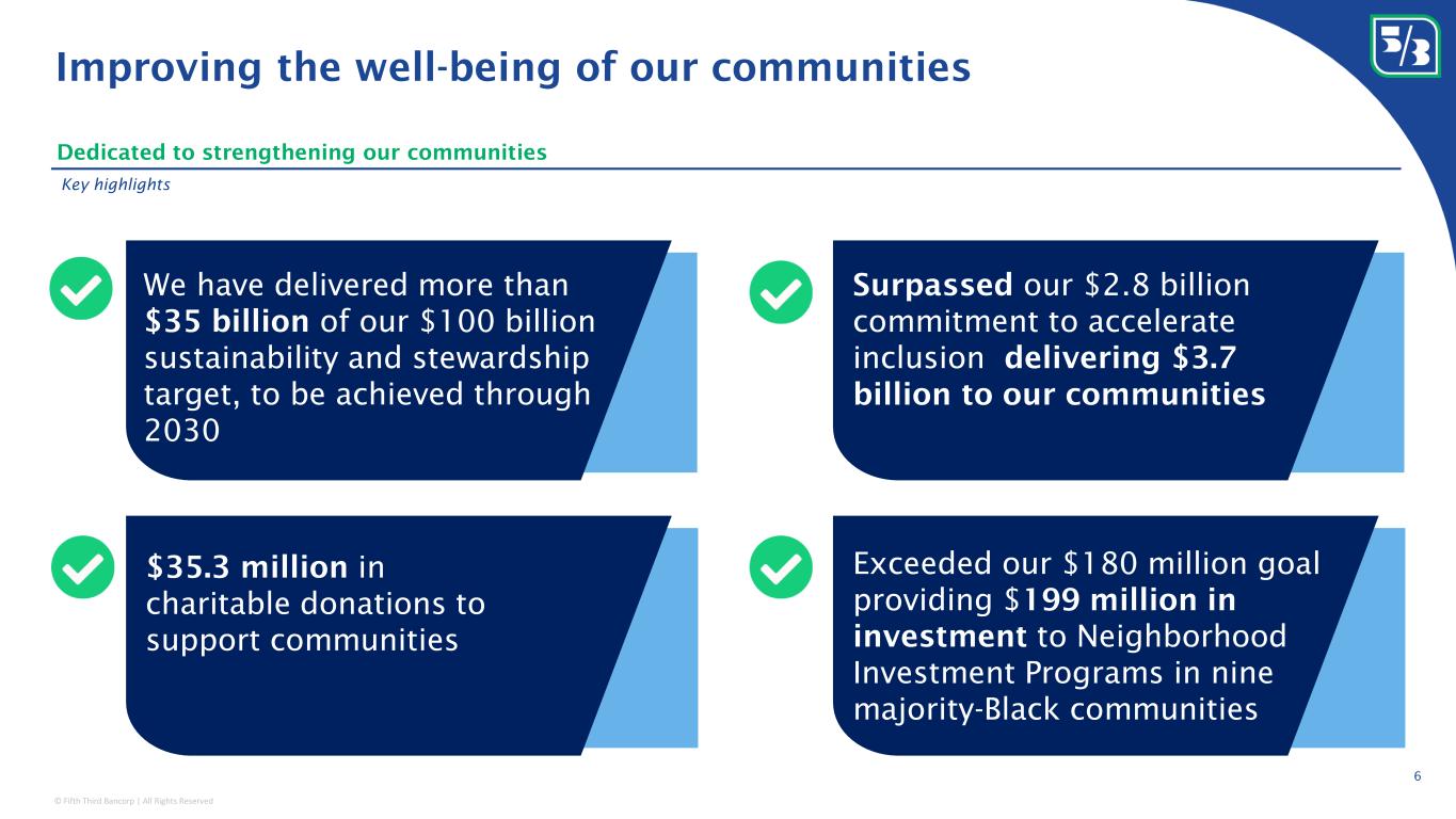 © Fifth Third Bancorp | All Rights Reserved Delivering innovations that empower customers Momentum Banking and Jeanie Fintech offerings Top 5 market share across several TM product categories 1 #2 residential solar national market share 1 Source: 2022 Cash Management Services Survey administered by EY Treasury Management 1.3M Momentum Households ~55% of total consumer Provide named one of the World’s Most Innovative Companies by Fast Company #2 practice finance national market share Jeanie®, Fifth Third’s artificial intelligence- powered digital assistant, leverages natural language understanding and large language models to facilitate ~200K customer interactions per month Embedded Payments The acquisition of Rize Money accelerated the launch of newline TM , our embedded payments business Managed Services Led by Expert AP, Expert AR, Cash Logistics, and the recent acquisition of Big Data Healthcare Fifth Third Momentum Banking Customer Experience received Outstanding Implementation of Digital CX Initiative by a Team - USA by The Digital Banker in 2022 TM Manag ed Serv ices 5 Services Treasury Manag ment