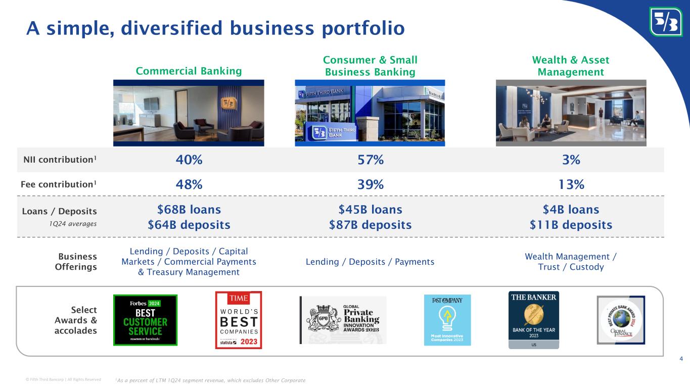 © Fifth Third Bancorp | All Rights Reserved Midwest footprint (branch count in white) Major FITB markets 2 with a top 5 deposit share London office Leading position in the markets we compete in 3 Key Southeast MSAs of focus Toronto office Top performing regional bank with local scale and national reach Assets, deposits, and branches as of 3/31/24; 1 Rankings consist of US commercial banks and exclude foreign, trust, & traditional investment banks; 2 Includes MSAs with $5BN+ in deposits on a capped basis (deposits per branch capped at $250MM per June 2023 FDIC data); 3 Data sourced from S&P Global Market Intelligence; 4 Deposits per branch capped at $250MM per June 2023 FDIC data; Midwest and Southeast rankings represent in footprint deposit market share; 5 Source: 2023 Cash Management Services Survey administered by EY 3 Fifth Third Corporate Headquarters Cincinnati, Ohio 249 161 100 157 67 5 41 76 10 29 175 Assets $215 billion Ranked 11 th in the U.S. 1 Deposits $170 billion Ranked 9 th in the U.S. 1 U.S. branches 1,070 Ranked 8 th in the U.S. 1 Commercial Payments Top 5 market share across several product categories 5 Southeast footprint (branch count in white) #2 #6Midwest Southeast unchanged YoY improved 2 spots YoY Deposit share rankings 4 #3 Fifth Third footprint improved 1 spot YoY Significant locational share in notable MSAs Nashville, TN Charlotte, NC #3 #4 Cincinnati, OH #1 Chicago, IL #3 Top 10 deposit share in ~90% of retail footprint Columbus, OH Indianapolis, IN #3 #3 Tampa, FL #6 Grand Rapids, MI #1