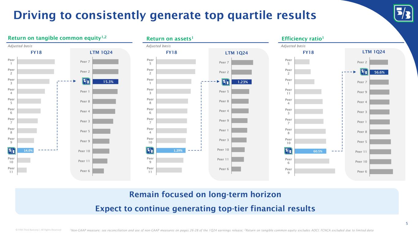 © Fifth Third Bancorp | All Rights Reserved Commercial Banking Lending / Deposits / Capital Markets / Commercial Payments & Treasury Management $68B loans $64B deposits Consumer & Small Business Banking Wealth & Asset Management Business Offerings Loans / Deposits $4B loans $11B deposits $45B loans $87B deposits Select Awards & accolades A simple, diversified business portfolio 4 NII contribution 1 Fee contribution 1 40% 57% 3% 48% 39% 13% 1Q24 averages Lending / Deposits / Payments Wealth Management / Trust / Custody 1 As a percent of LTM 1Q24 segment revenue, which excludes Other Corporate