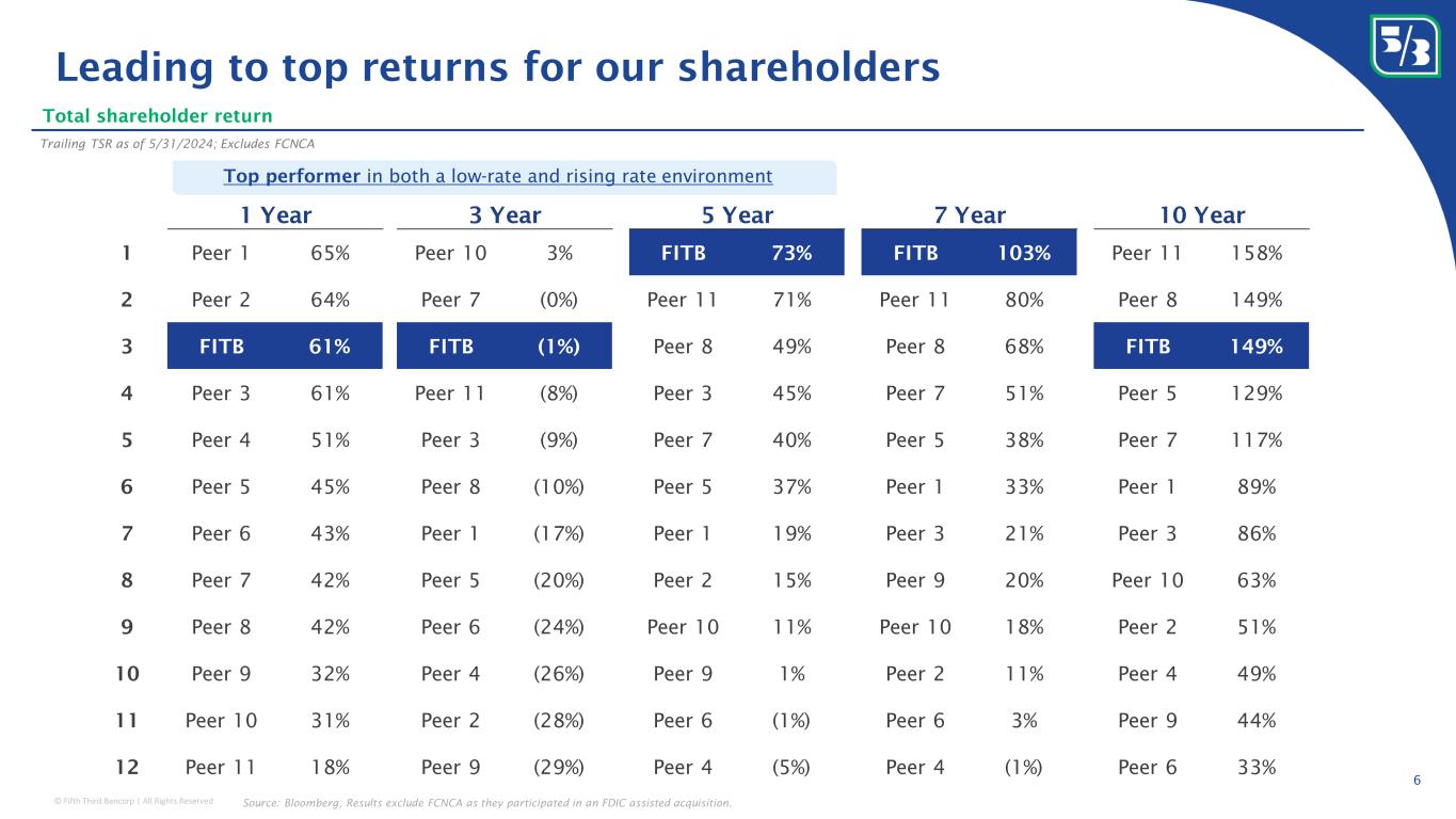 © Fifth Third Bancorp | All Rights Reserved 1.23% Peer 7 Peer 2 x Peer 5 Peer 8 Peer 4 Peer 9 Peer 1 Peer 3 Peer 10 Peer 11 Peer 6 15.3% Peer 7 Peer 2 x Peer 1 Peer 8 Peer 4 Peer 3 Peer 5 Peer 9 Peer 10 Peer 11 Peer 6 60.5% Peer 9 Peer 6 x Peer 10 Peer 8 Peer 7 Peer 3 Peer 4 Peer 11 Peer 1 Peer 2 Peer 5 14.0% Peer 1 Peer 2 Peer 3 Peer 4 Peer 5 Peer 6 Peer 7 Peer 8 Peer 9 x Peer 10 Peer 11 1.29% Peer 5 Peer 2 Peer 1 Peer 3 Peer 8 Peer 6 Peer 7 Peer 4 Peer 10 x Peer 9 Peer 11 Driving to consistently generate top quartile results 5 Return on tangible common equity 1,2 1 Non-GAAP measure: see reconciliation and use of non-GAAP measures on pages 26-28 of the 1Q24 earnings release; 2 Return on tangible common equity excludes AOCI; FCNCA excluded due to limited data FY18 LTM 1Q24 FY18 FY18 Return on assets 1 Efficiency ratio 1 Adjusted basis Adjusted basis Adjusted basis Remain focused on long-term horizon Expect to continue generating top-tier financial results 56.6% Peer 2 x Peer 7 Peer 9 Peer 4 Peer 3 Peer 1 Peer 8 Peer 5 Peer 11 Peer 10 Peer 6 LTM 1Q24 LTM 1Q24