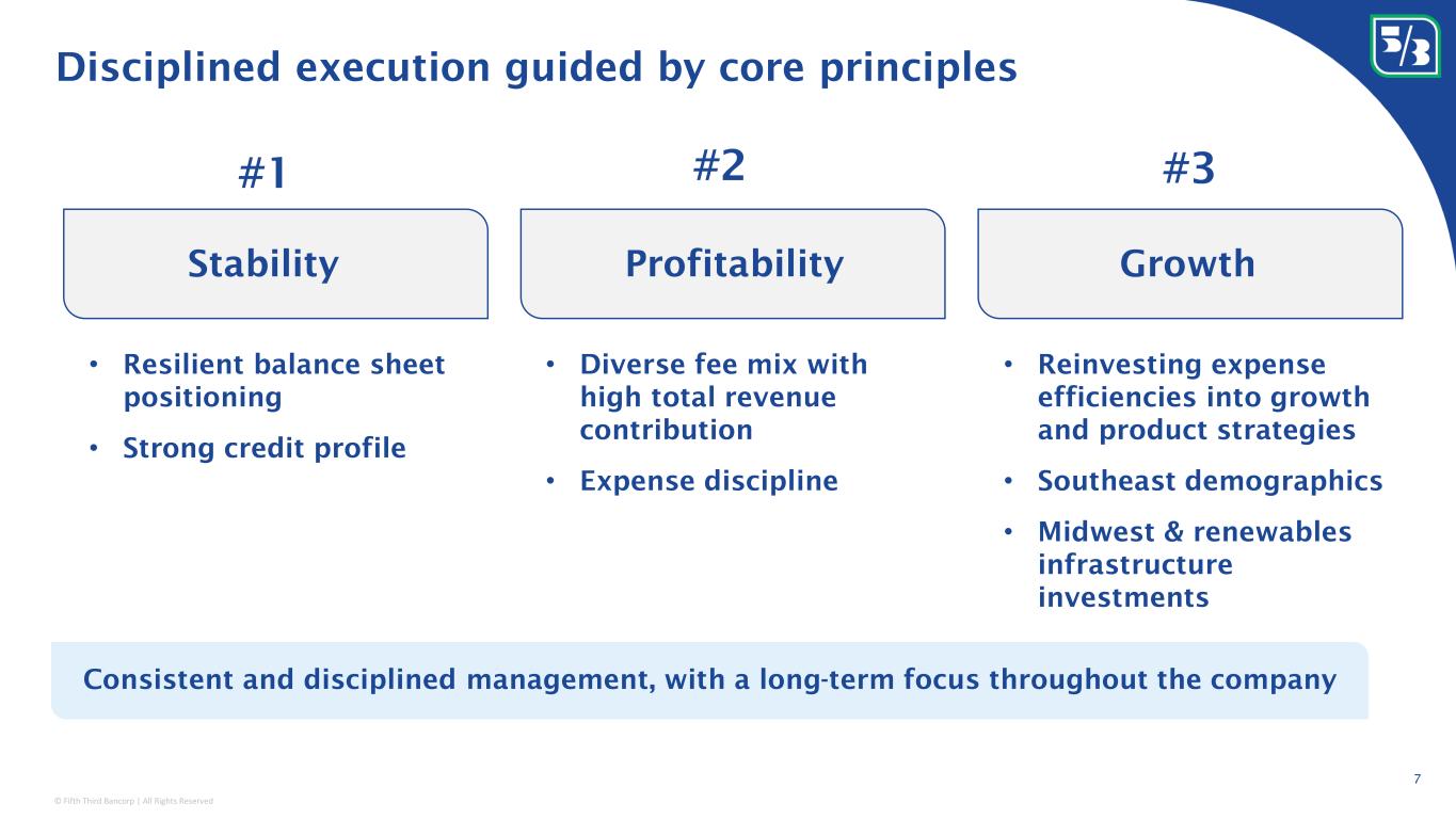© Fifth Third Bancorp | All Rights Reserved Leading to top returns for our shareholders 6 Total shareholder return Source: Bloomberg; Results exclude FCNCA as they participated in an FDIC assisted acquisition. Top performer in both a low-rate and rising rate environment Trailing TSR as of 5/31/2024; Excludes FCNCA 1 Year 3 Year 5 Year 7 Year 10 Year 1 Peer 1 65% Peer 10 3% FITB 73% FITB 103% Peer 11 158% 2 Peer 2 64% Peer 7 (0%) Peer 11 71% Peer 11 80% Peer 8 149% 3 FITB 61% FITB (1%) Peer 8 49% Peer 8 68% FITB 149% 4 Peer 3 61% Peer 11 (8%) Peer 3 45% Peer 7 51% Peer 5 129% 5 Peer 4 51% Peer 3 (9%) Peer 7 40% Peer 5 38% Peer 7 117% 6 Peer 5 45% Peer 8 (10%) Peer 5 37% Peer 1 33% Peer 1 89% 7 Peer 6 43% Peer 1 (17%) Peer 1 19% Peer 3 21% Peer 3 86% 8 Peer 7 42% Peer 5 (20%) Peer 2 15% Peer 9 20% Peer 10 63% 9 Peer 8 42% Peer 6 (24%) Peer 10 11% Peer 10 18% Peer 2 51% 10 Peer 9 32% Peer 4 (26%) Peer 9 1% Peer 2 11% Peer 4 49% 11 Peer 10 31% Peer 2 (28%) Peer 6 (1%) Peer 6 3% Peer 9 44% 12 Peer 11 18% Peer 9 (29%) Peer 4 (5%) Peer 4 (1%) Peer 6 33%