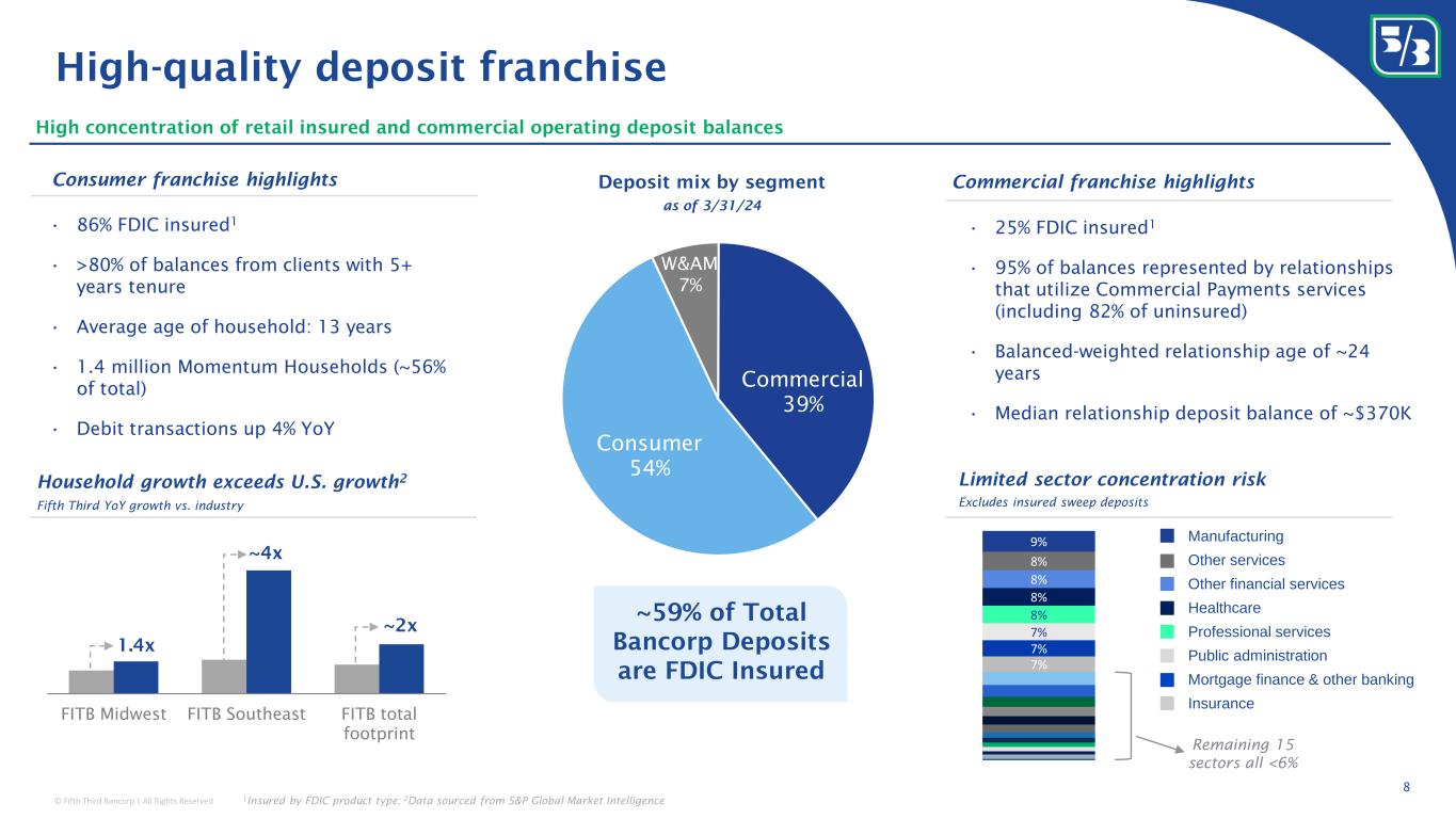 © Fifth Third Bancorp | All Rights Reserved Disciplined execution guided by core principles Stability Profitability Growth Consistent and disciplined management, with a long-term focus throughout the company 7 • Resilient balance sheet positioning • Strong credit profile • Diverse fee mix with high total revenue contribution • Expense discipline • Reinvesting expense efficiencies into growth and product strategies • Southeast demographics • Midwest & renewables infrastructure investments #2 #3#1