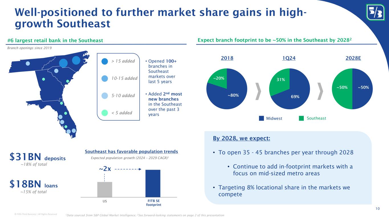 © Fifth Third Bancorp | All Rights Reserved 30% 32% 35% 36% 36% 41% 43% 46% 46% 57% 57% 63% 75% 26% 34% 21% 43% 14% 3% 23% 22% 23% 6% 30% 14% 14% 35% 13% 30% 20% 12% 23% 20% 29% 18% 17% 11% 18% 8% Peer 12 Peer 11 Peer 10 Peer 9 Peer 8 Peer 7 Peer 6 Peer 5 Peer 4 Peer 3 Peer 2 x Peer 1 MSA Rankings 1-3 MSA Rankings 4-5 MSA Rankings 6-10 MSA Rankings 10+/No MSA Maintaining top quartile deposit density while expanding branch network in the Southeast 9 Deposit density market rank 1 Source: S&P Global Market Intelligence and company filings; 1 Represents percentage of deposits (capped at $1billion) of MSA total deposit rankings We continue to focus on achieving a top 5 rank in the MSAs we serve Total Top 5 89% 77% 87% 63% 69% 68% 66% 44% 50% 79% 56% 66% 56%